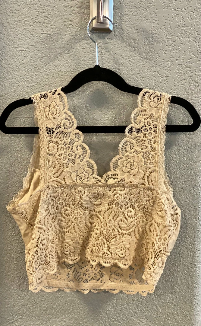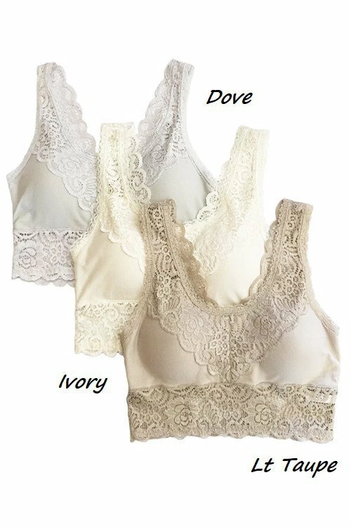 Padded lace bralette with a pretty rounded neckline, scalloped edges and an allover floral lace design. The back features a v hemline as well.