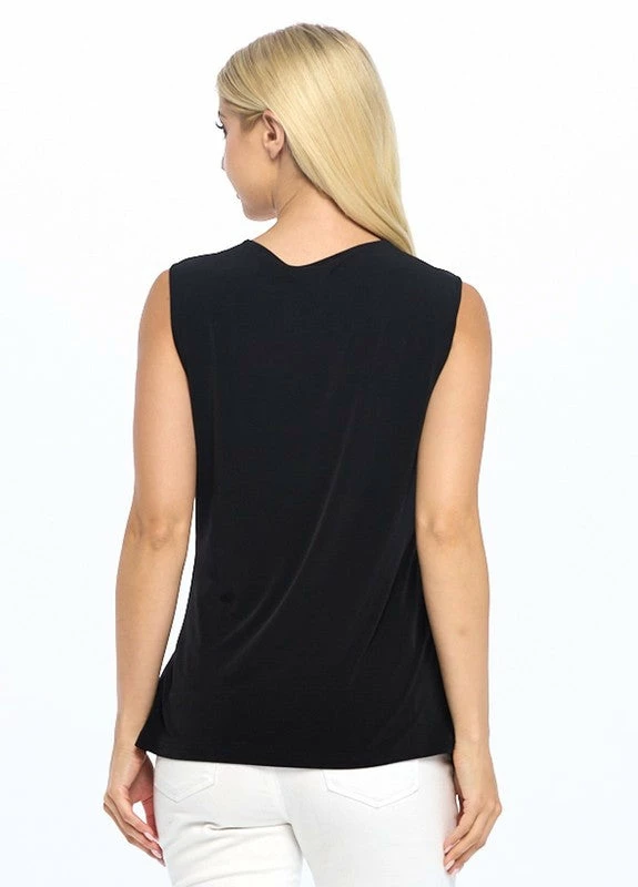 Sleeveless black wrap top.