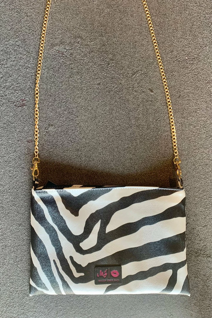 The Makeup Junkie Safari Domingo crossbody bag features a vegan leather zebra exterior with a pearl sheen. The bag has a wipeable black interior.