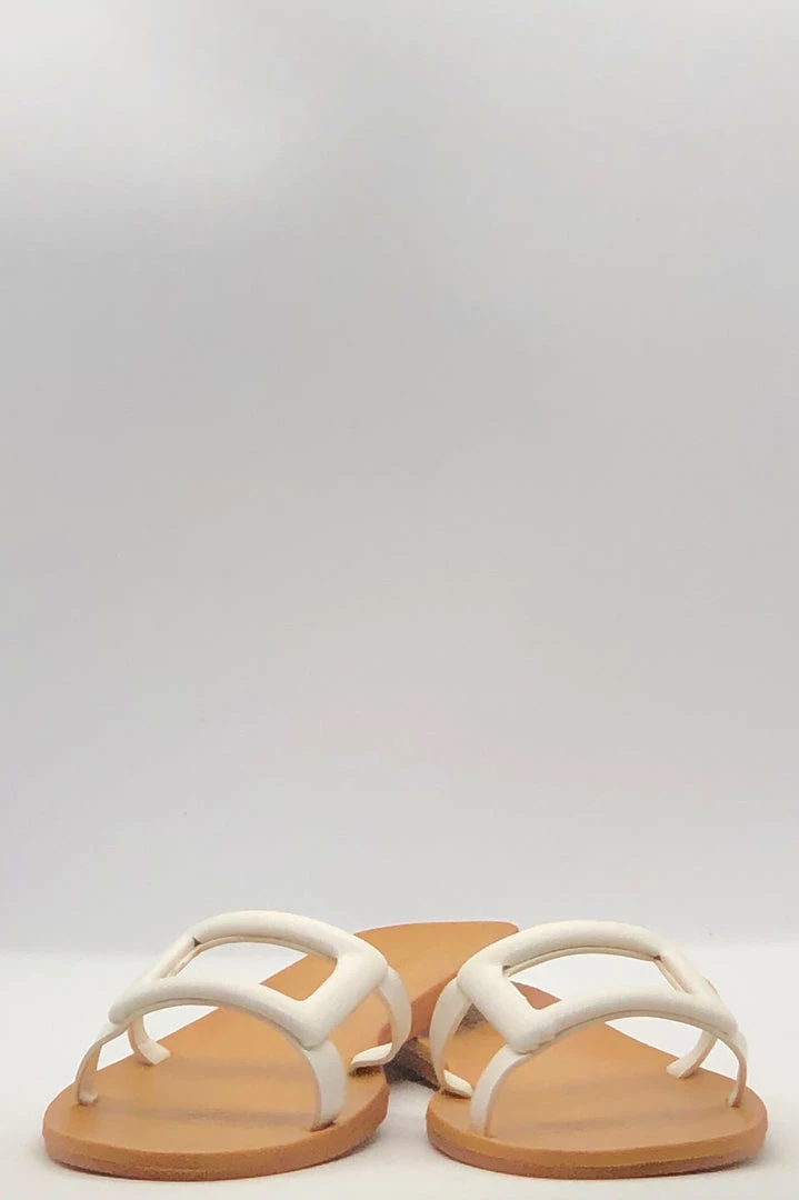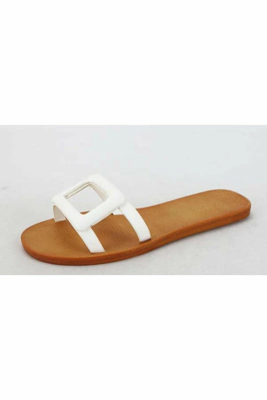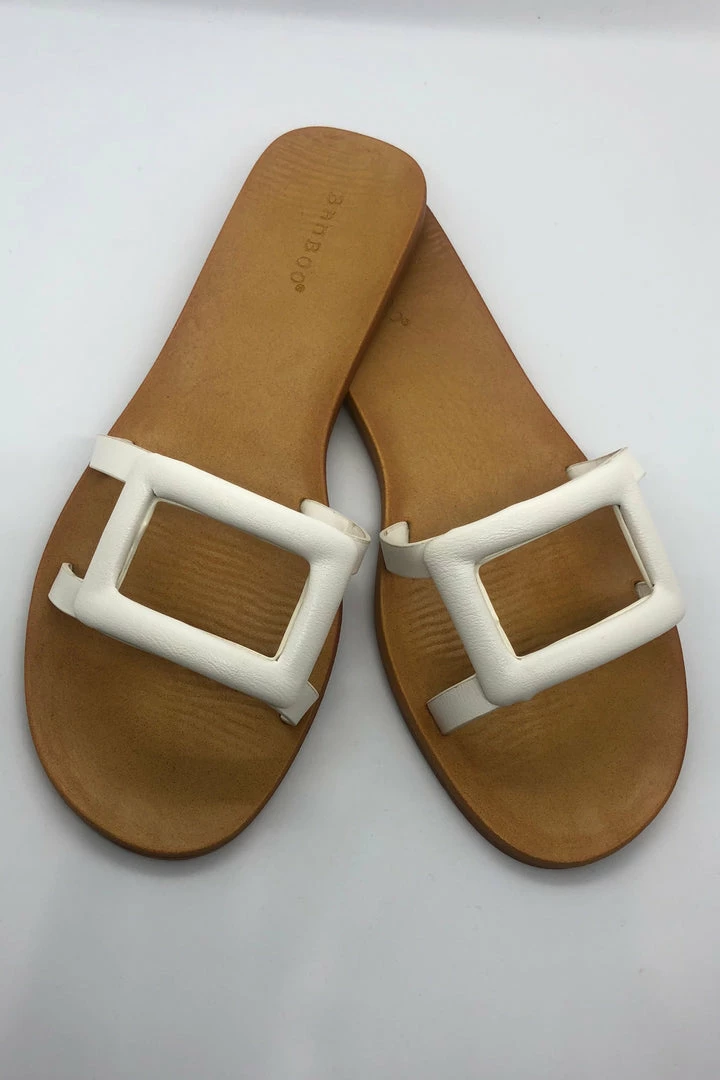 Open-toe vegan leather slide sandals feature a cut-out caged design, with skinny straps and a frame- or buckle-like box accent over the toes.