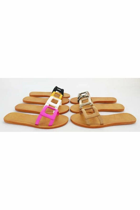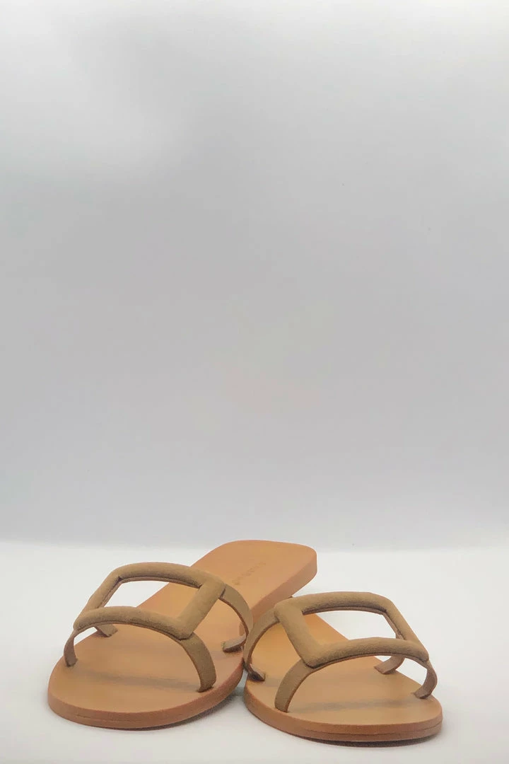 Open-toe vegan leather slide sandals feature a cut-out caged design, with skinny straps and a frame- or buckle-like box accent over the toes.