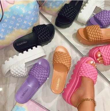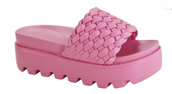 Slide on platform sandals with lug sole.