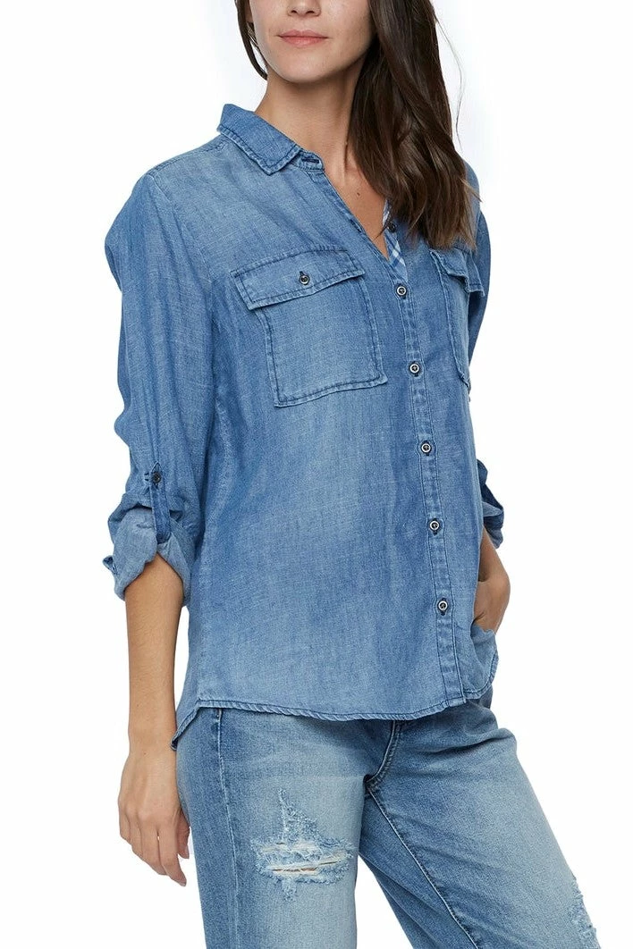 Super soft, light denim wash with rolled sleeves and two front pockets.