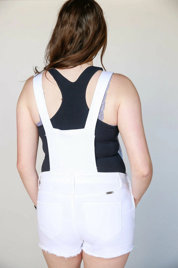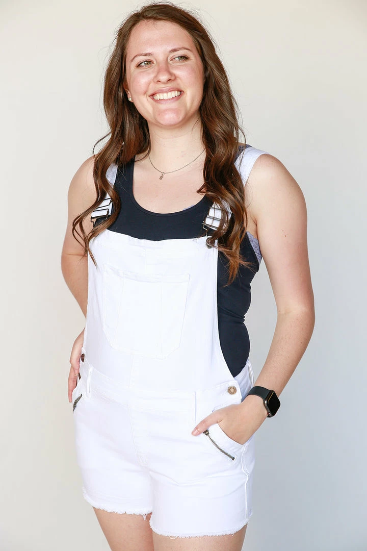 Adjustable straps, Bib front, Side button closure and belt loops.