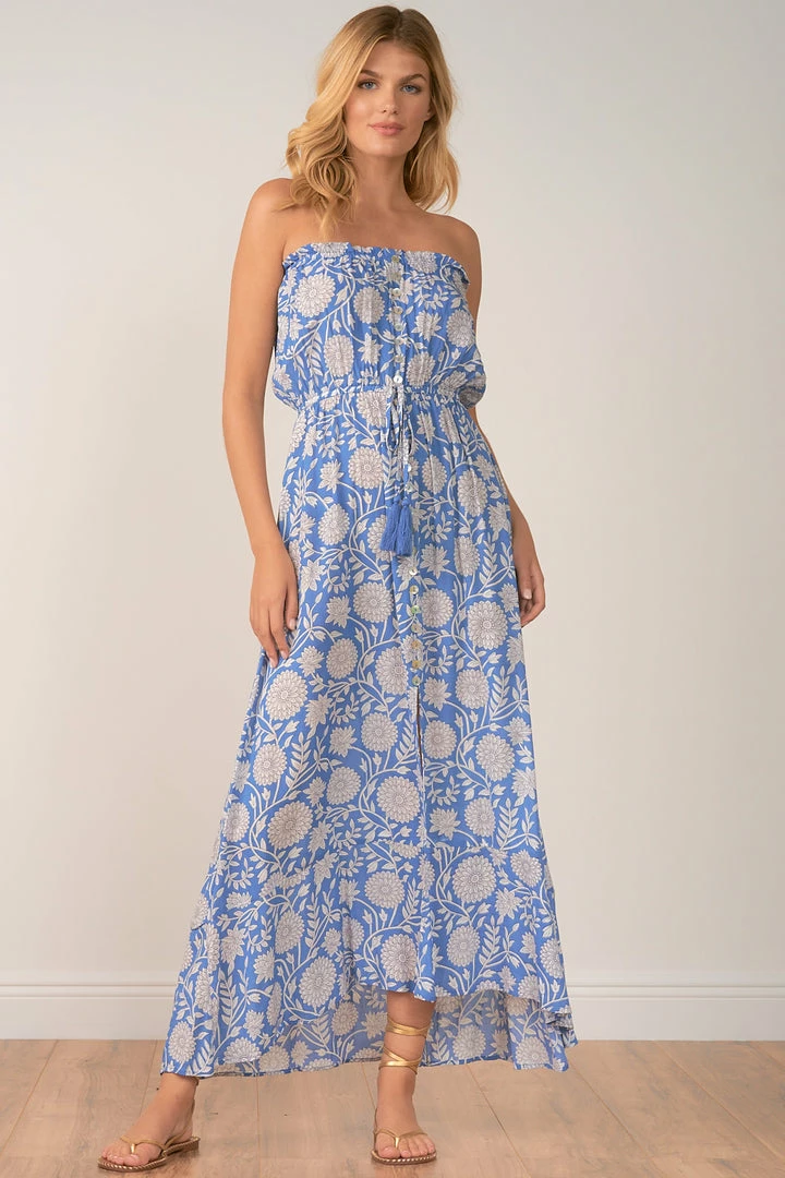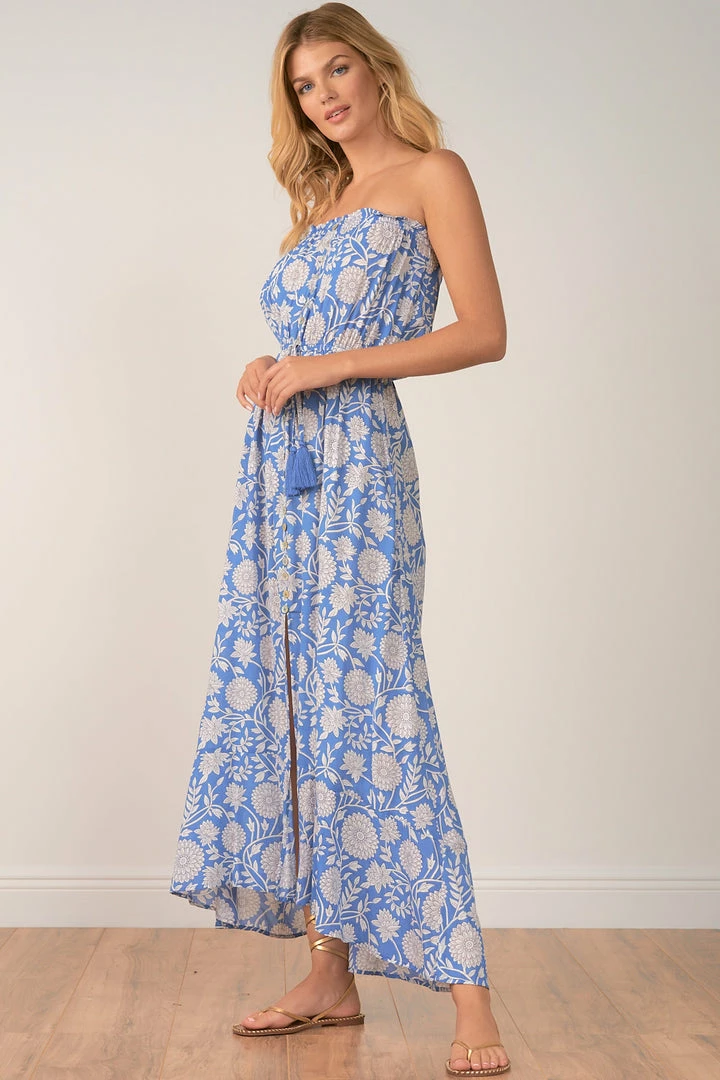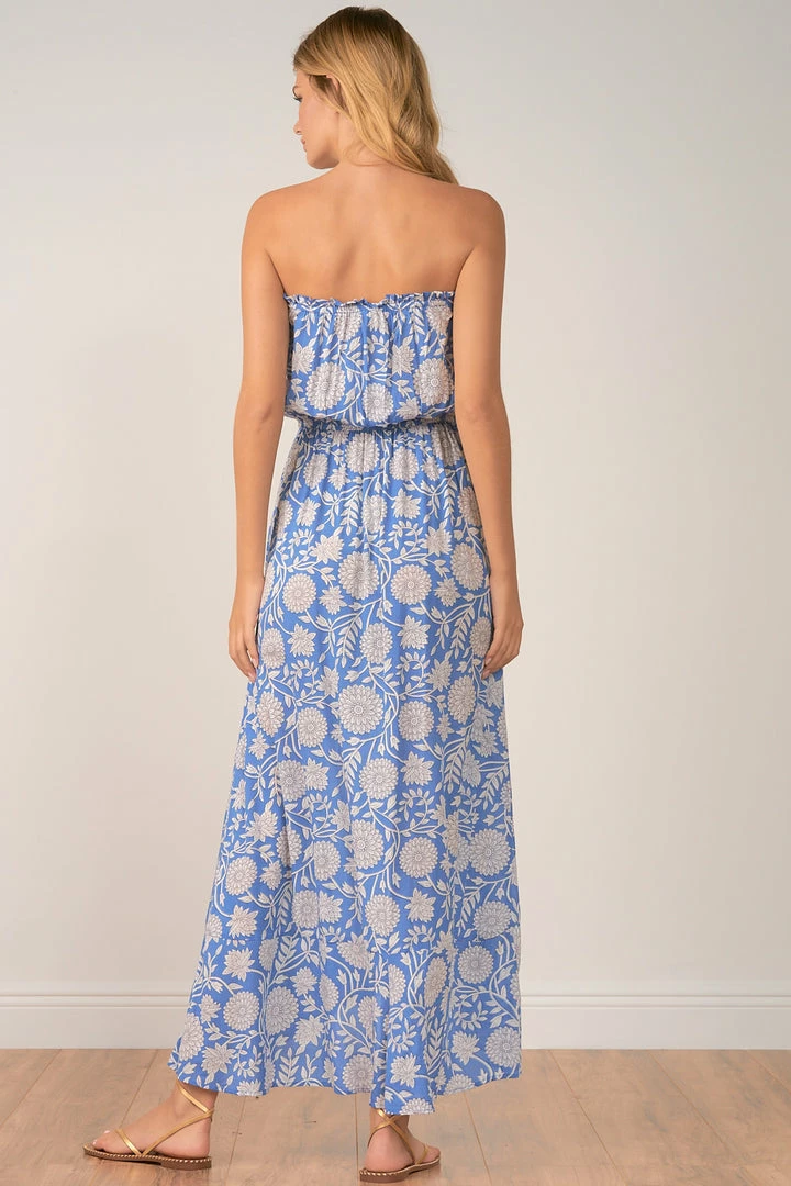 Caribbean bloom strapless maxi with front slit.