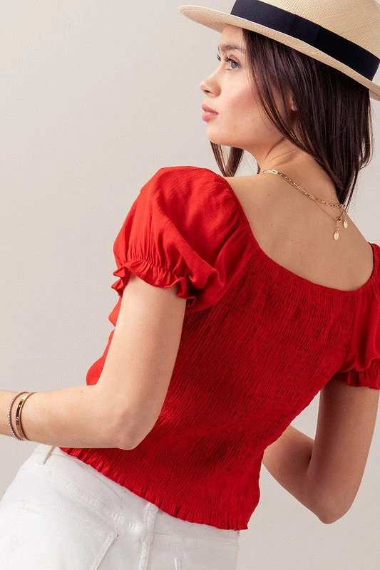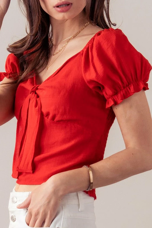 The adorable linen crop top pairs perfectly with shorts or a skirt.