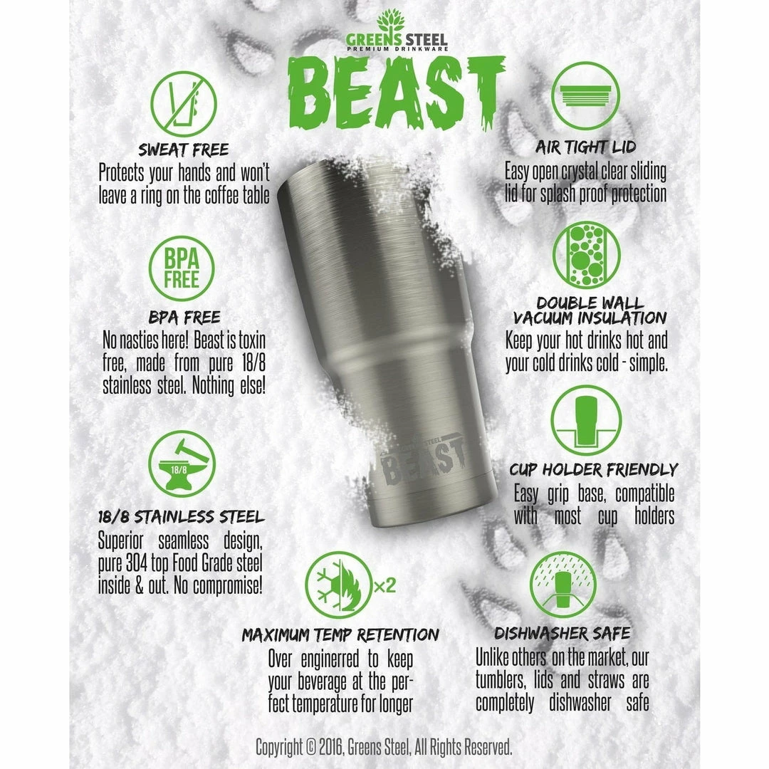 Presenting the Beast Bundle: 1 Pure 18/8 food-grade stainless steel curved straw & 1 Closable Sliding Spill Resistant Shatterproof Crystal Clear BPA Free Lid, all presented in a beautiful Gift Box. MAX INSULATION & TEMPERATURE RETENTION Over engineered and tested against Yeti and other leading brands.