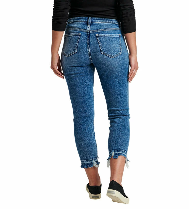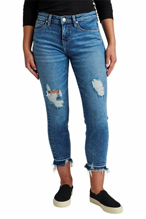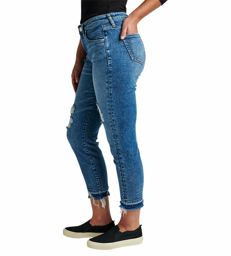 Your go-to boyfriend jean just got a slimmer, more feminine update with our Carter Girlfriend. It’s designed with a comfortable mid rise and ease through the hip and thigh for a perfectly relaxed silhouette. This pair’s crafted in our power stretch denim that molds to your body and features great retention but still looks classic. Finished with a medium-light indigo wash with destruction at the knees and a frayed released hem.