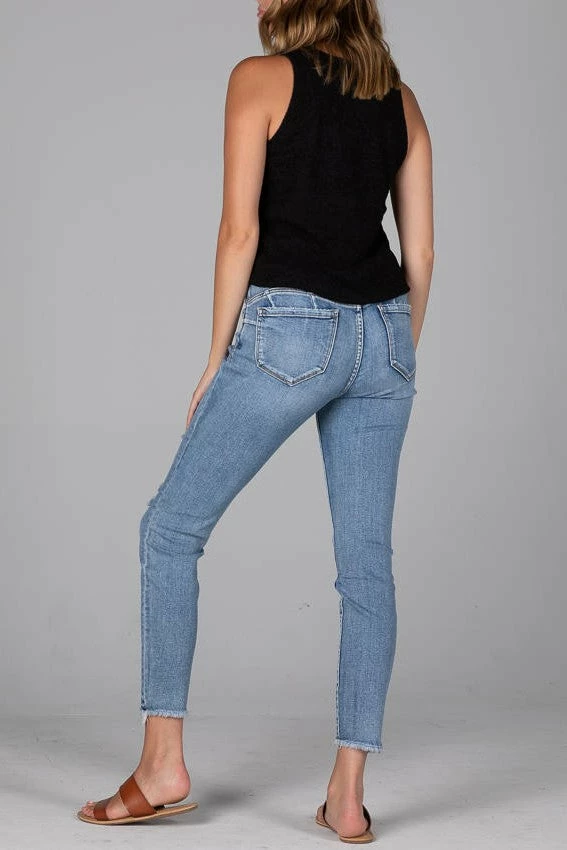 An always-classic skinny jean that smooths, supports and lifts like no other—say hello to Cecilia. This fit is crafted with the classic mid rise you love and also features our Best Kept Secret technology. That means smoothing mesh tummy panels and a butt-lifting back yoke… talk about flattering. Finished with classic pocketing, an authentically distressed medium indigo wash and frayed hem for worn-in appeal. This pair’s designed in our sustainable Premium Stretch denim that’s developed with less water than traditional denim and features REPREVE® recycled polyester made from recycled content, including plastic bottles. Its power stretch technology molds to your body and perfectly retains its shape, which means it stretches without ever stretching out.