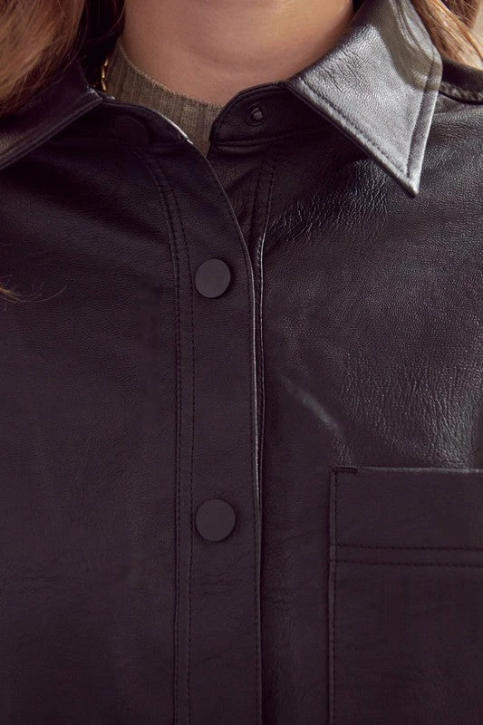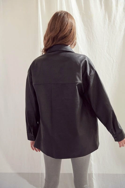 Black faux leather jacket with an oversized fit that drapes over the body for a trendy look that goes well with any fit. Our Phoebe oversized shirt Jacket is sleek and chic, perfect for covering up during the colder seasons. It’s oversized feel gives it a trendy feel but it’s simplistic sleek design still gives it that classic vibe. Features one front chest pocket, basic collar, and button snaps for an added luxe look.