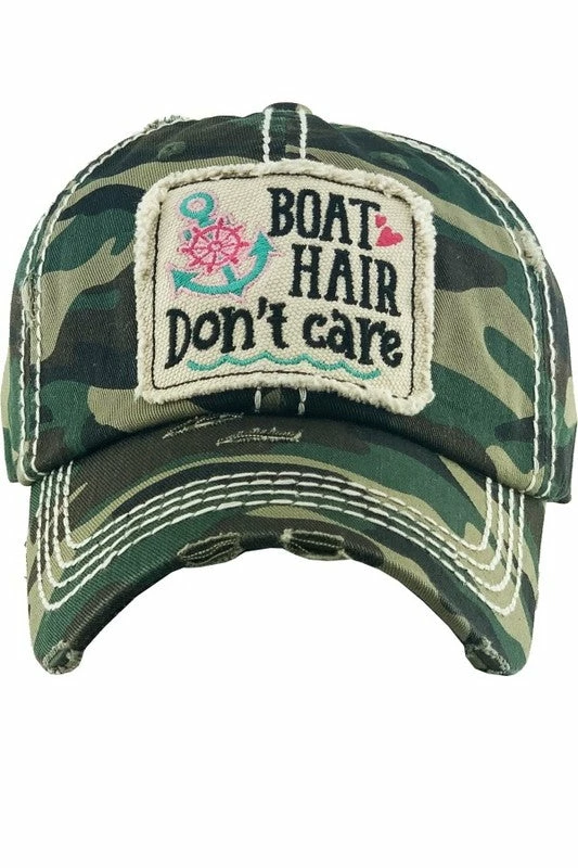 Distressed, Camo Boat Hair, Don’t Care baseball cap.
