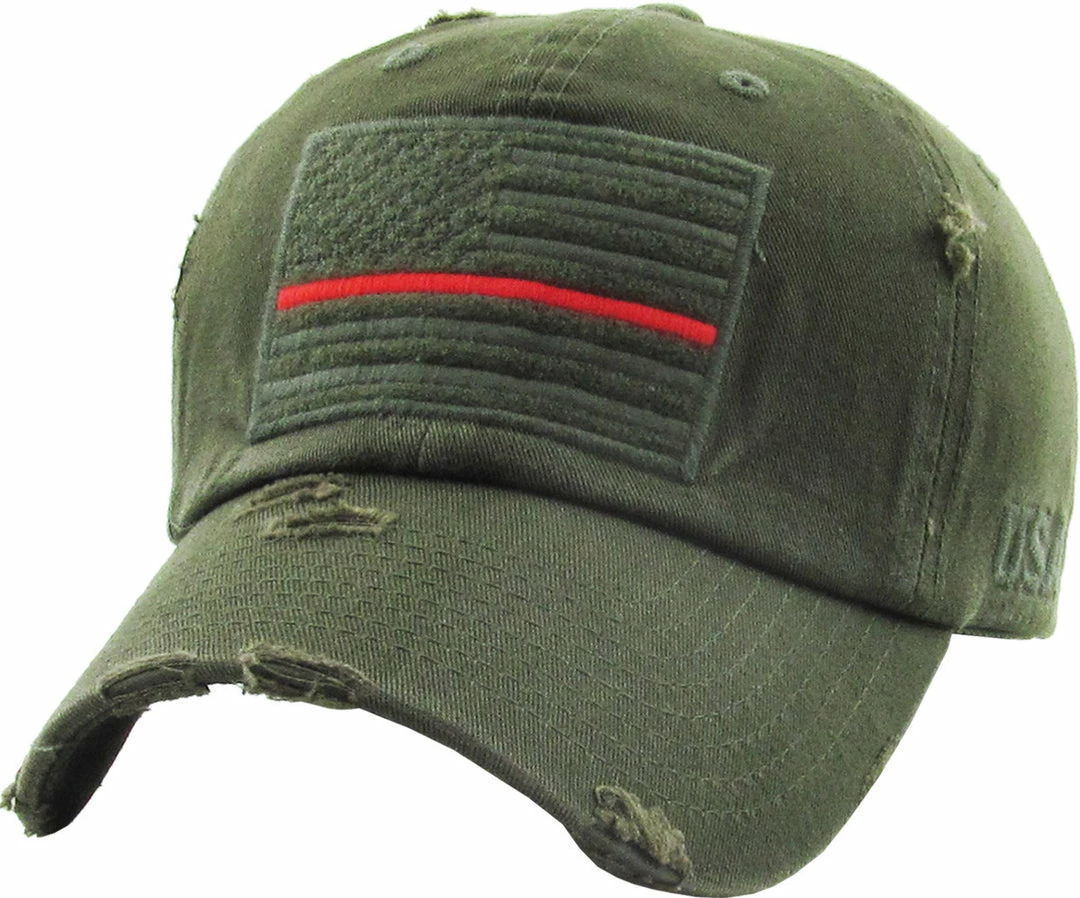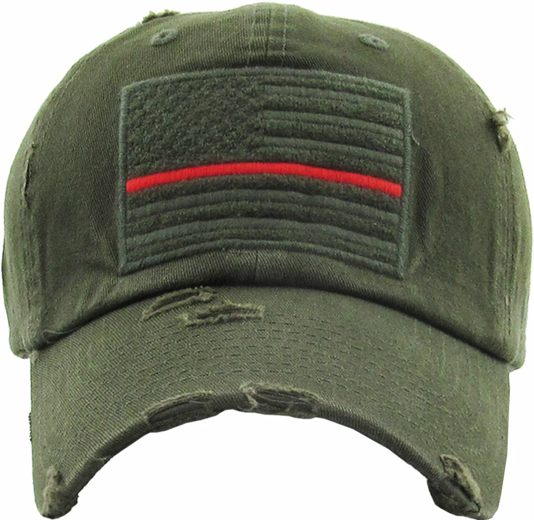 Distressed American Flag baseball cap with the Thin Red Line supporting firefighters.
