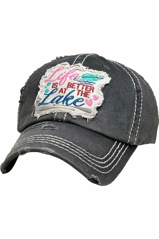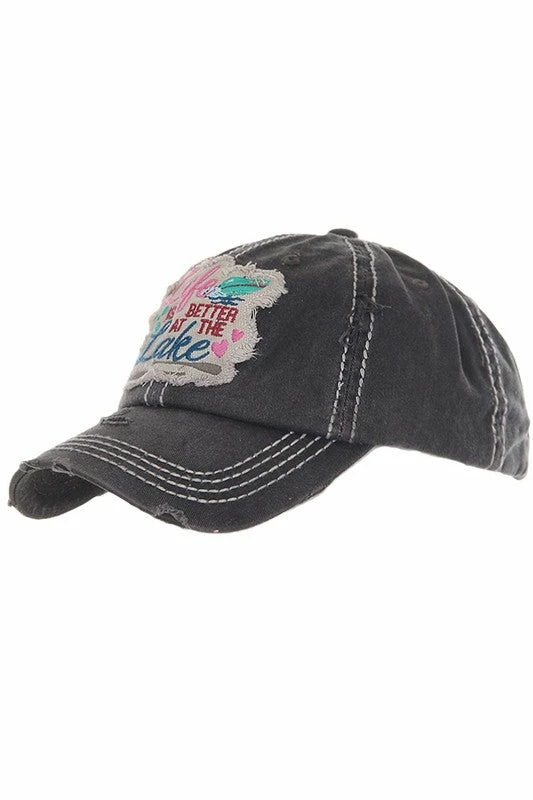 Distressed “Life Is A Better At The Lake” baseball cap.