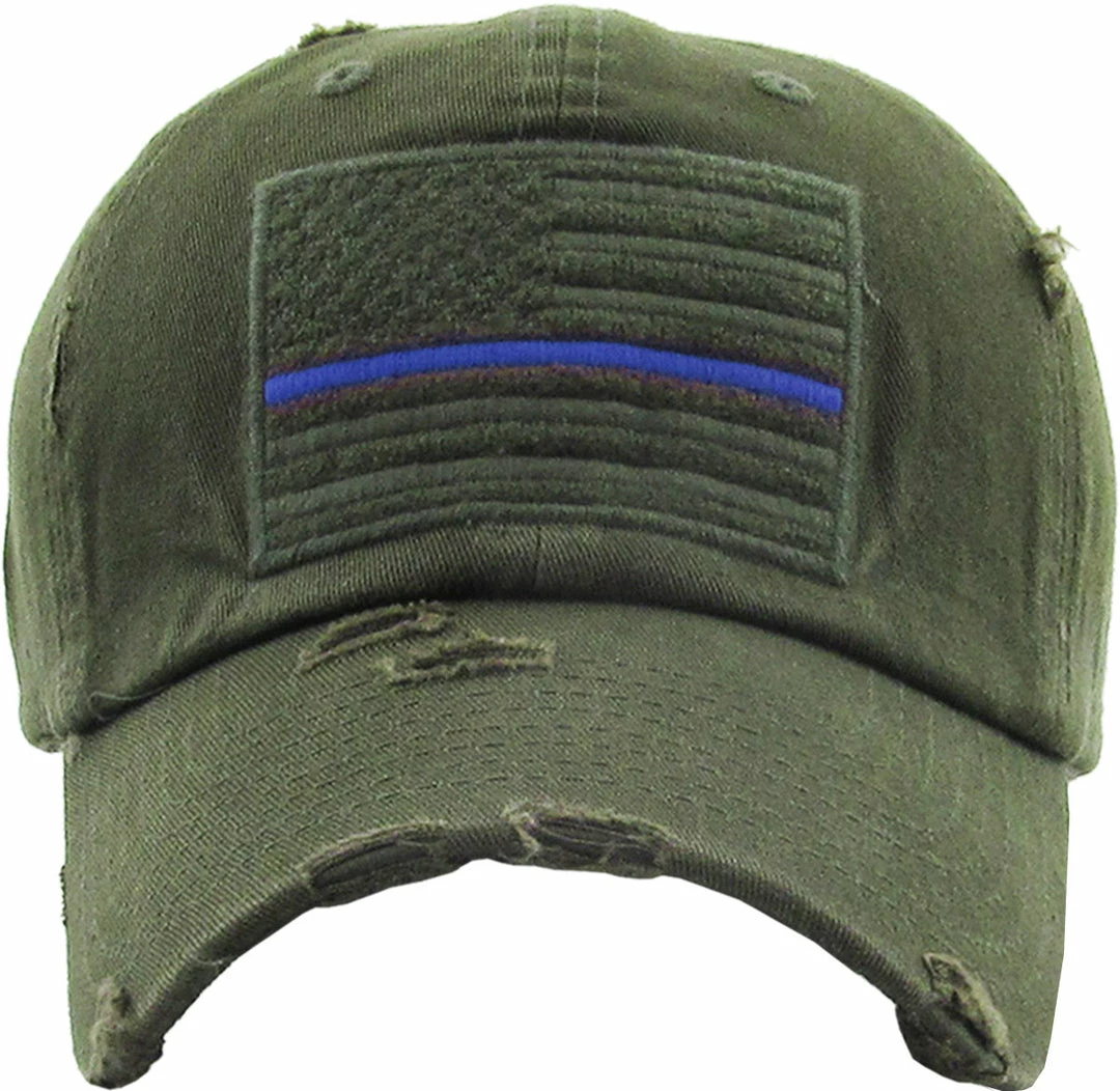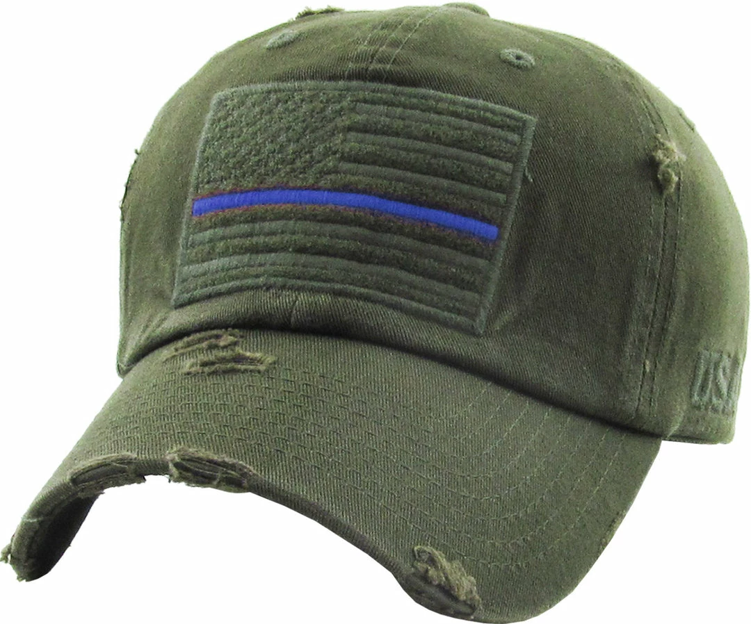Distressed American Flag baseball cap with the Thin Blue Line supporting law enforcement.