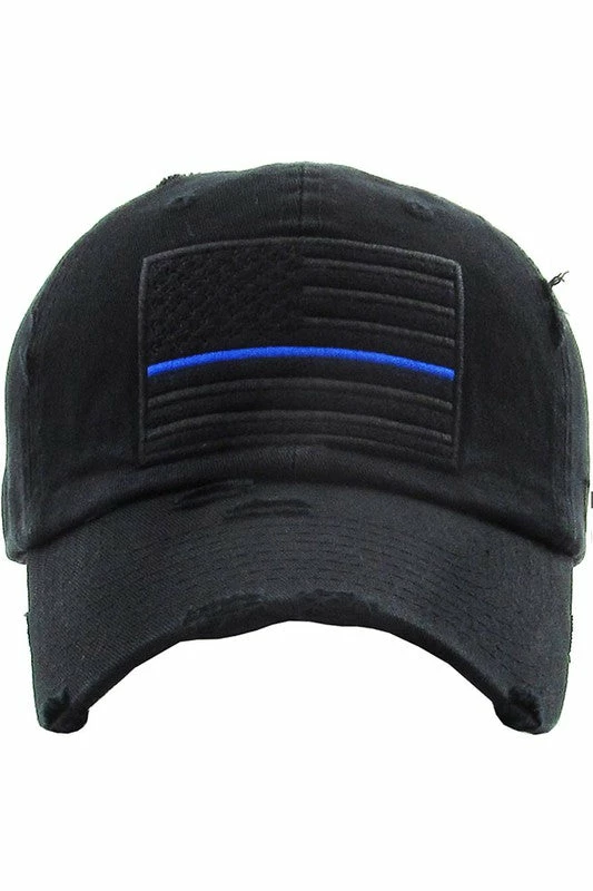 Distressed American Flag baseball cap with the Thin Blue Line supporting law enforcement.