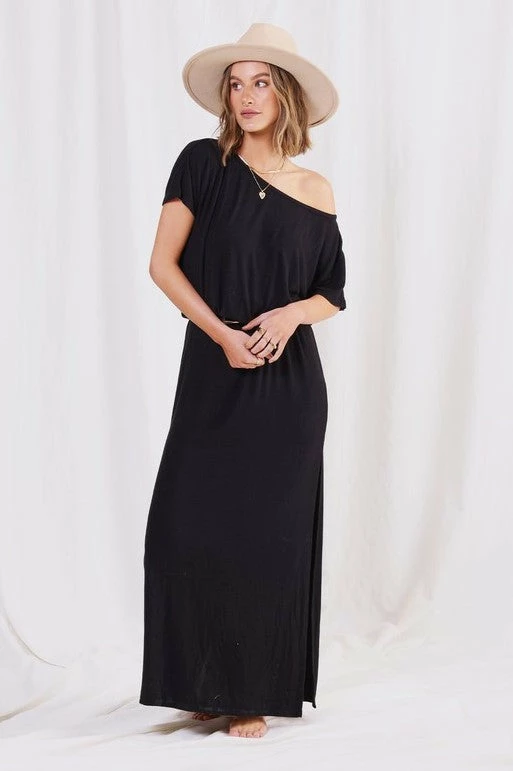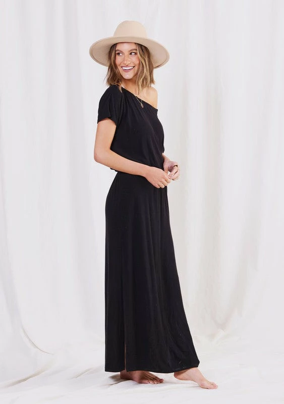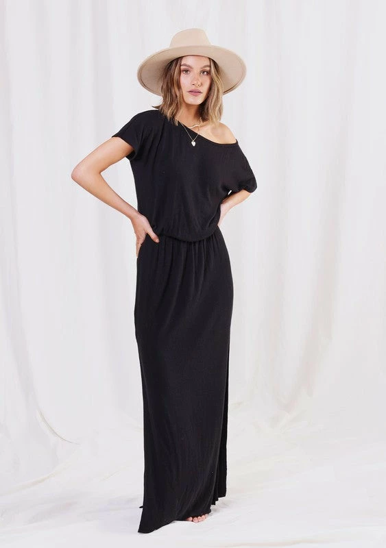 A chic draped maxi dress featuring a bamboo micro rib, an off-shoulder drape, a boat neckline, an elastic waistband, a slouchy, draped oversized top, and two side slits.