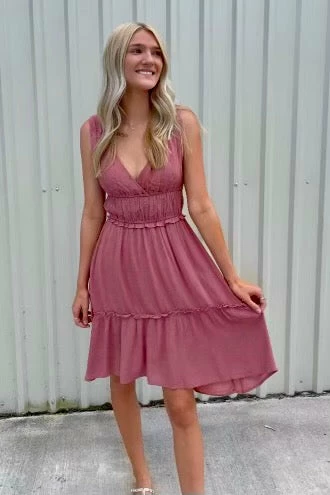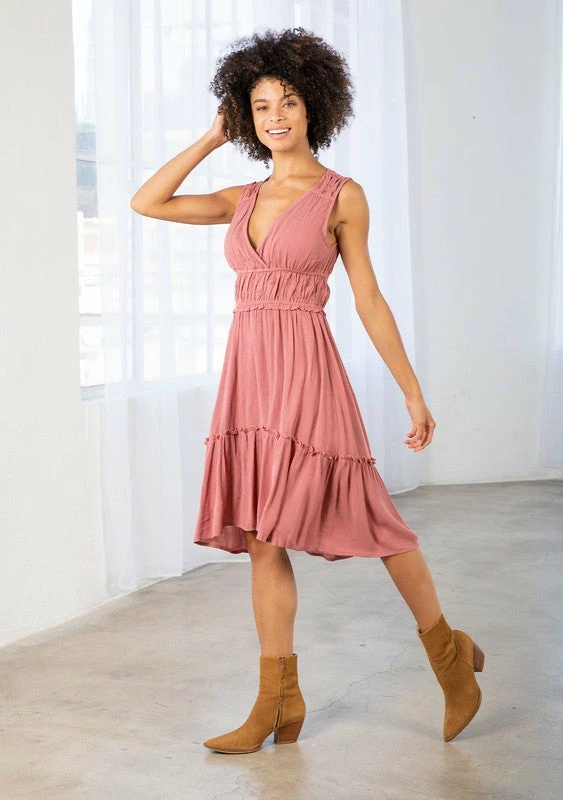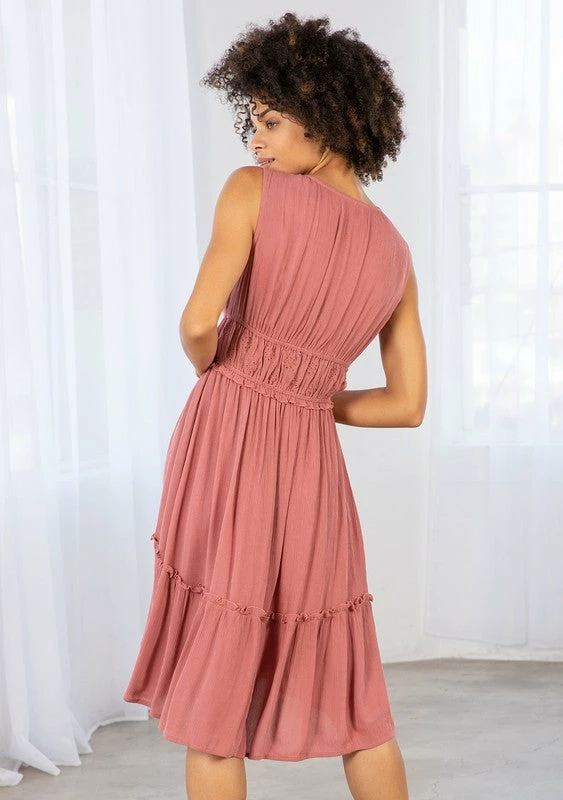 Rayon gauze sleeveless boho tank midi dress featuring eyelet waist detail, a tiered skirt, ruffle detail, and a hi-low hem.
