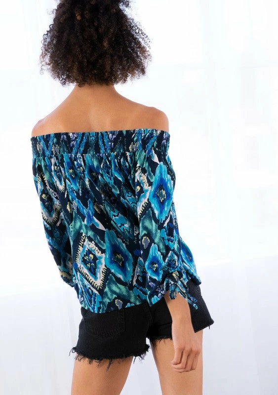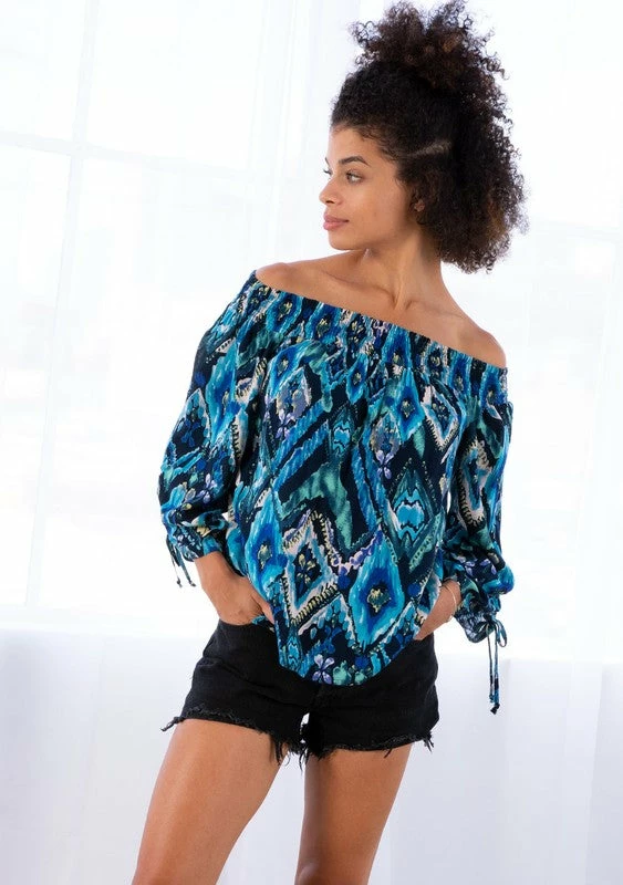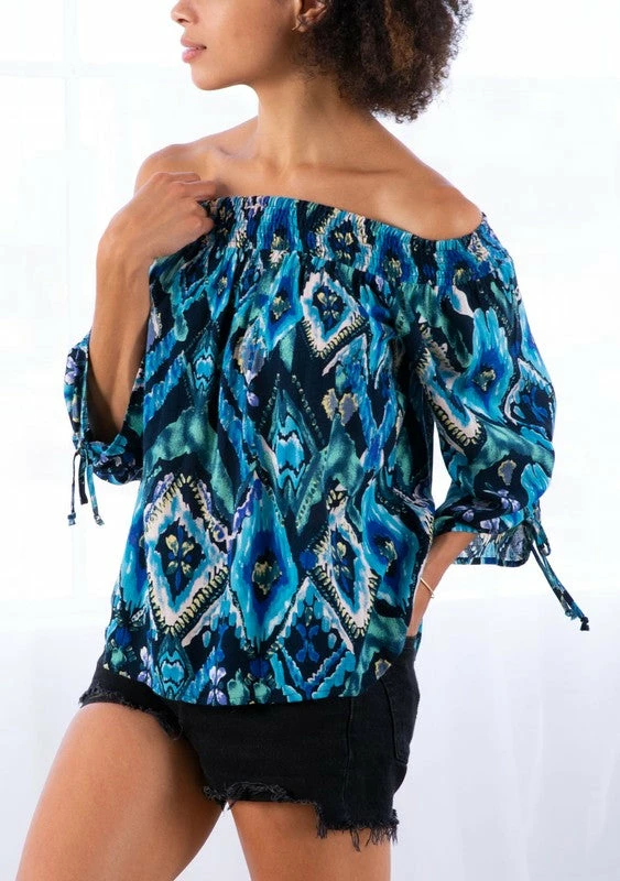 A Summer inspired off shoulder smocked top featuring a 3/4 voluminous sleeve with a ruched sleeve tie and a flowy relaxed silhouette.