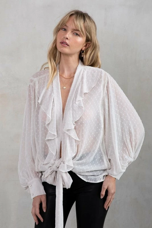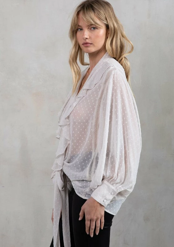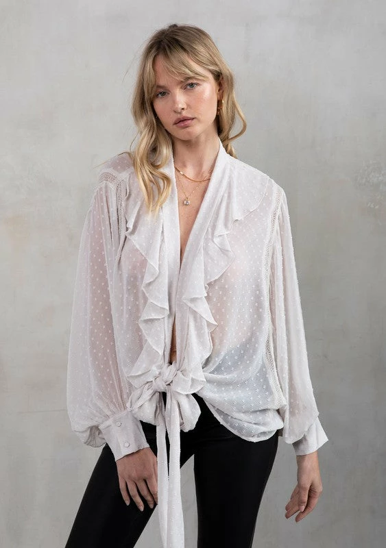 With multiple ways to style it, you’ll find yourself reaching for this dreamy top over and over again. Our swiss dot kimono top features a flirty ruffled lapel, long batwing sleeves with a self-covered button wrist cuff, and a tie front detail. We love to style this ethereal blouse over a bralette with leather trousers for a chic party look.