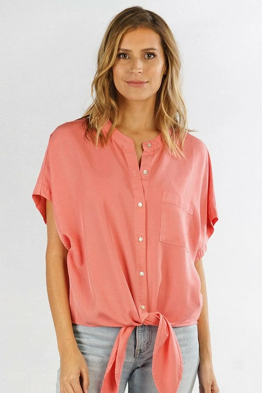Tencel button front top featuring a mandarin collar, a front chest pocket, short kimono sleeves, and a trendy front tie detail. Just in time for the warmer weather.