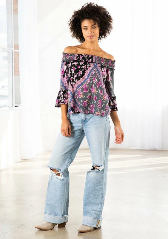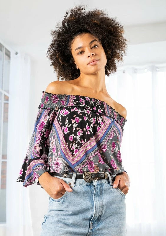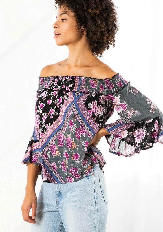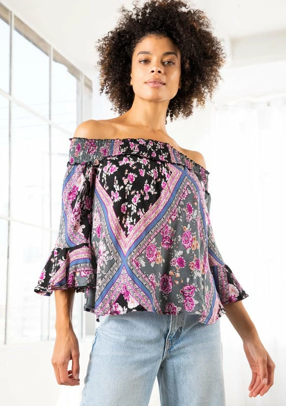 Bohemian smocked off the shoulder blouse in an abstract geometric floral print. Features a 3/4 flutter sleeve and a relaxed flowy silhouette
