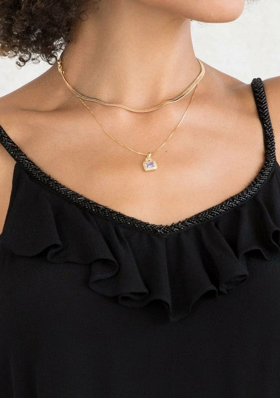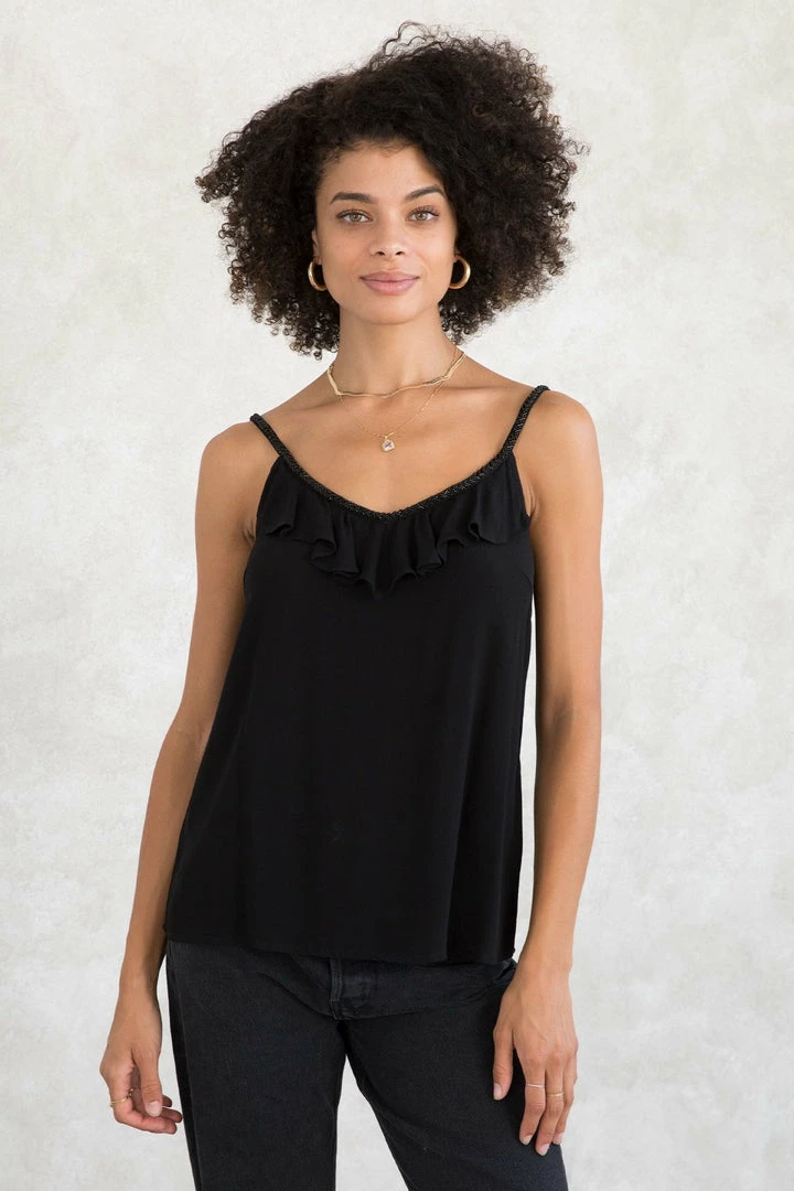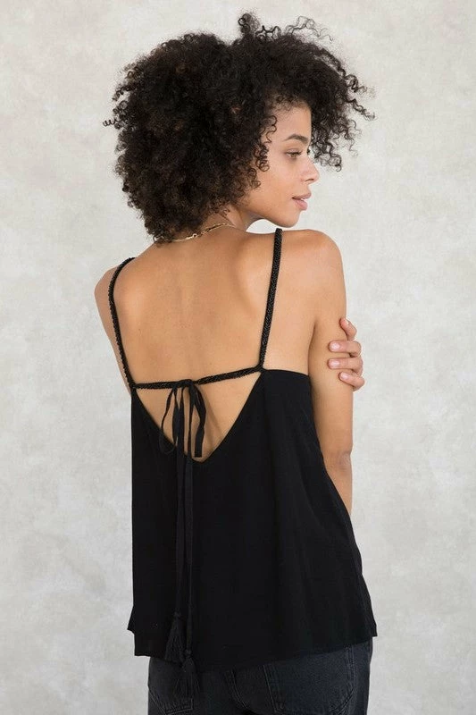 Chic holiday tank top featuring a ruffled v neckline, adjustable spaghetti straps, a beautiful beaded detail, and a strappy back with tassel ties.