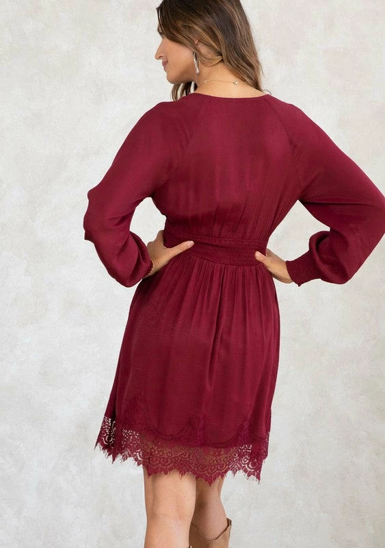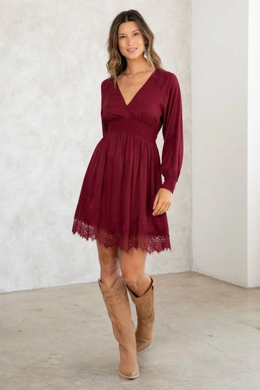 Holiday-ready long sleeve mini dress featuring a pretty scalloped lace hem, a smocked waist and cuff, and a plunging v neckline.