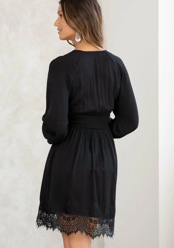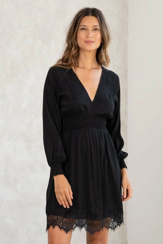 Holiday-ready long sleeve mini dress featuring a pretty scalloped lace hem, a smocked waist and cuff, and a plunging v neckline.