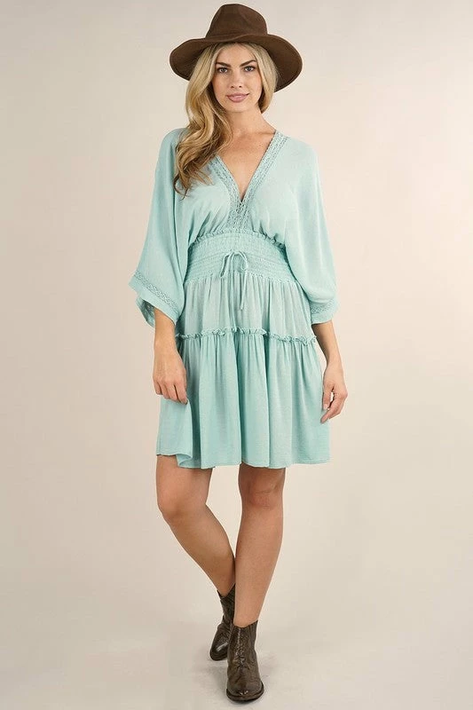 Bohemian mini dress in a soft feather print with subtle metallic details throughout. Featuring a v-neckline, long split sleeves with a smocked elastic wrist cuff, an open back with tassel tie closure, a smocked elastic waist for definition, and a ruffle trimmed tiered skirt.