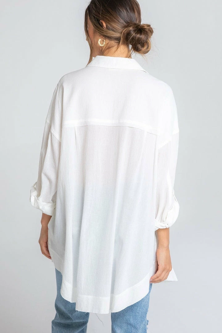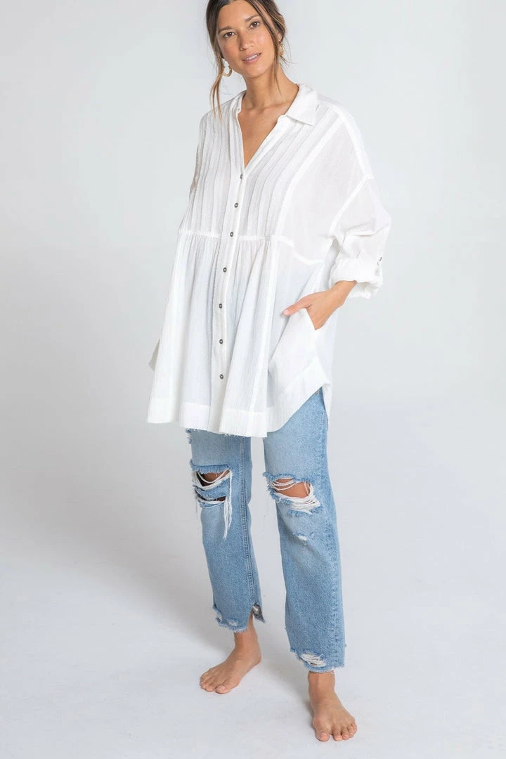 Ultra-relaxed and flowy, this effortless tunic top is our go-to style for Spring and Summer. Featuring long rolled sleeves with a button tab closure, pleated front details, and a button-up front. The raw edge hemline adds a lived-in feel.