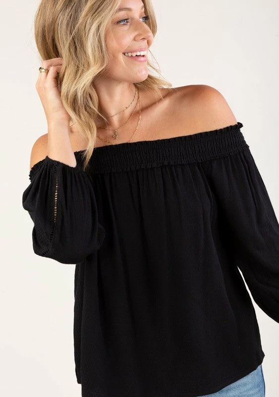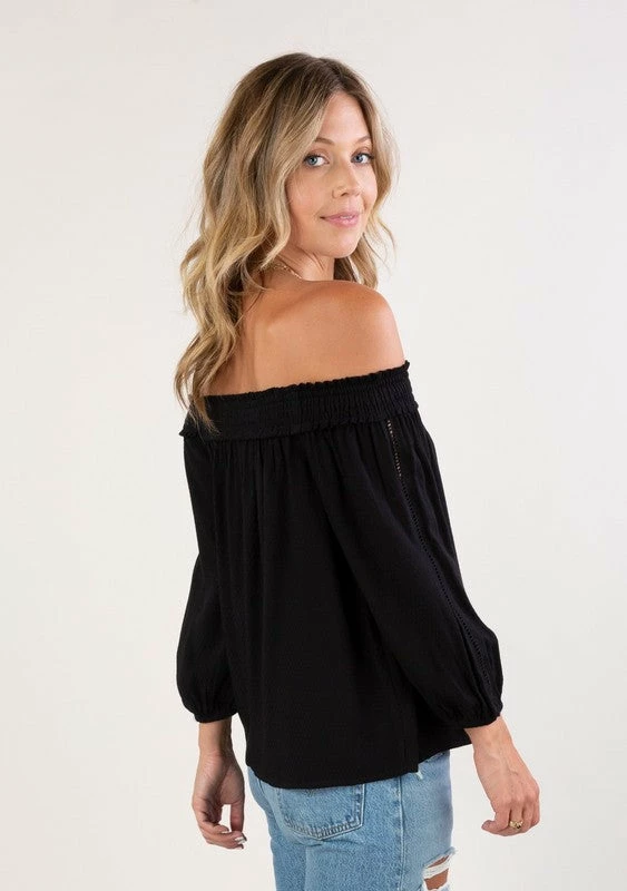 Off the shoulder top with lattice trim detail. Features a 3/4 sleeve and elastic cuffs.