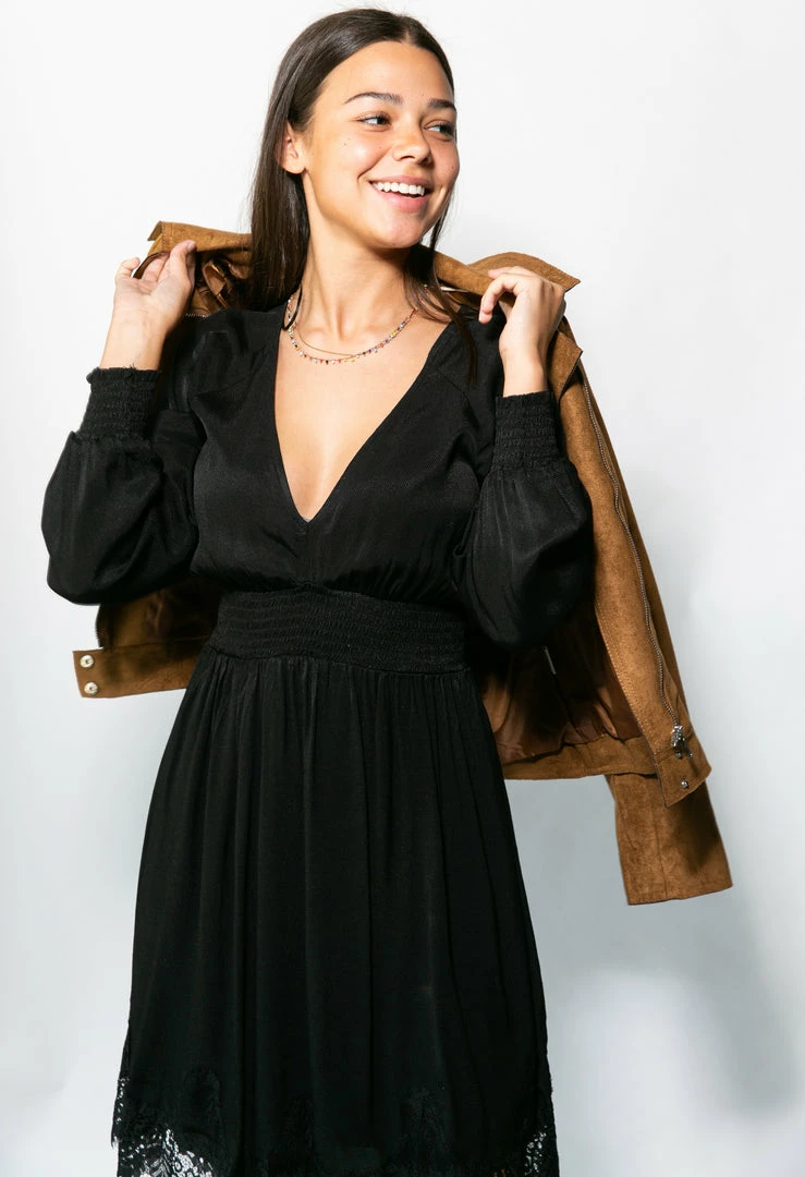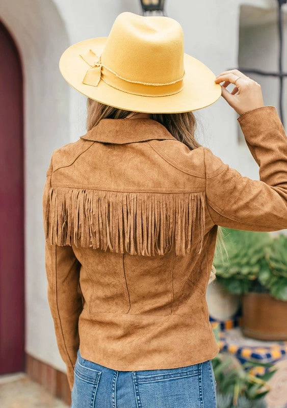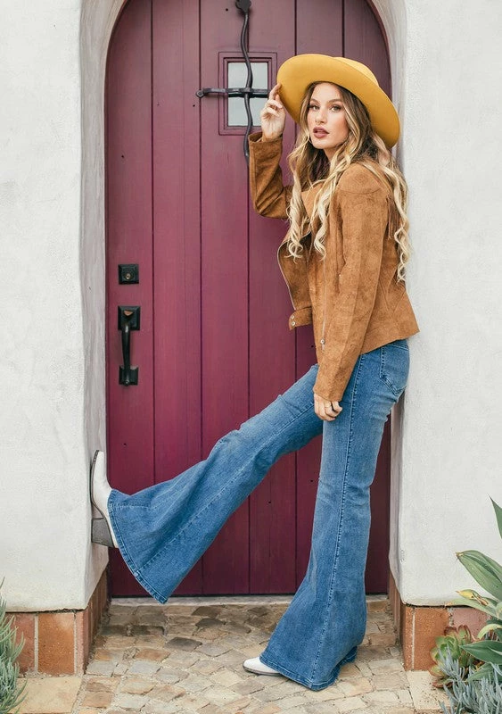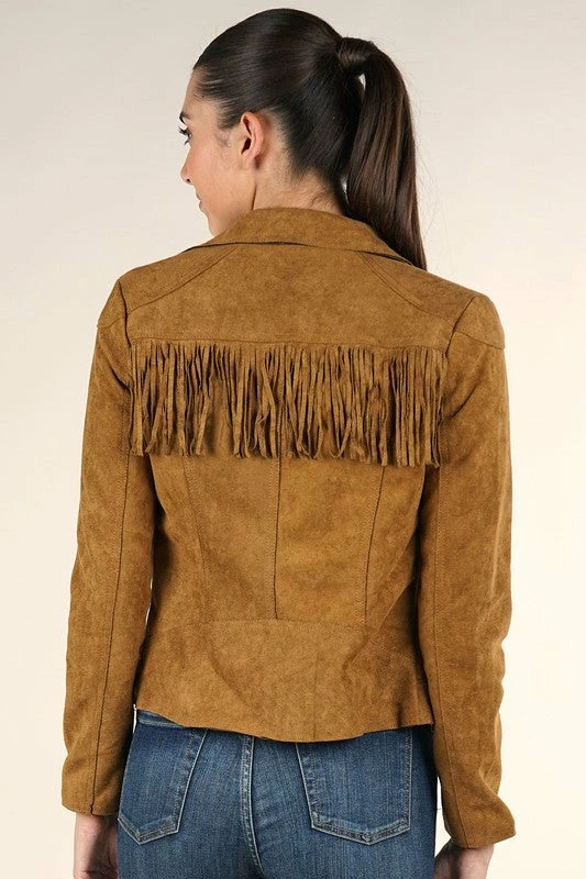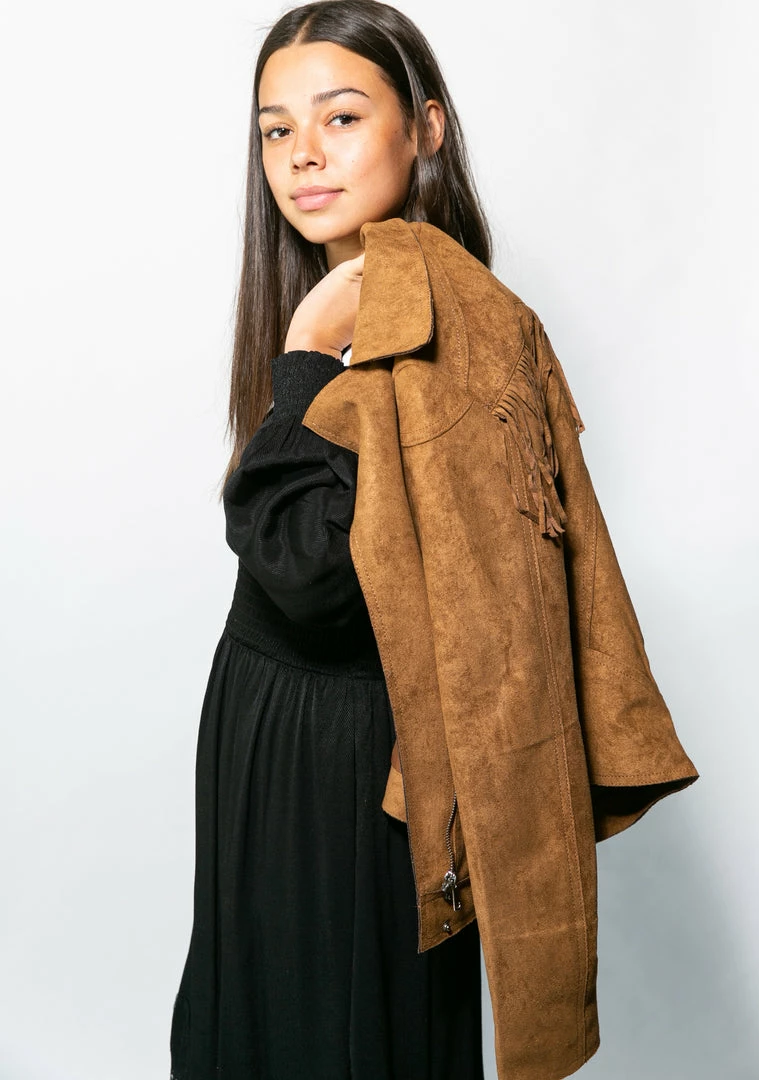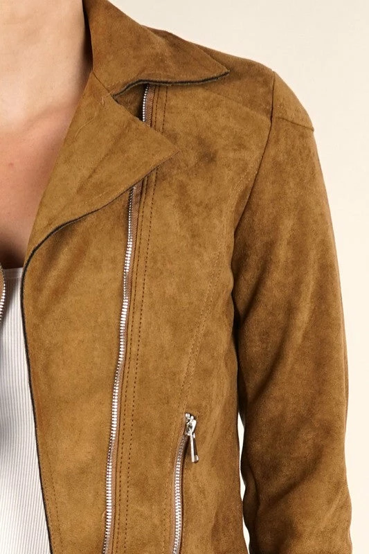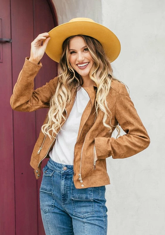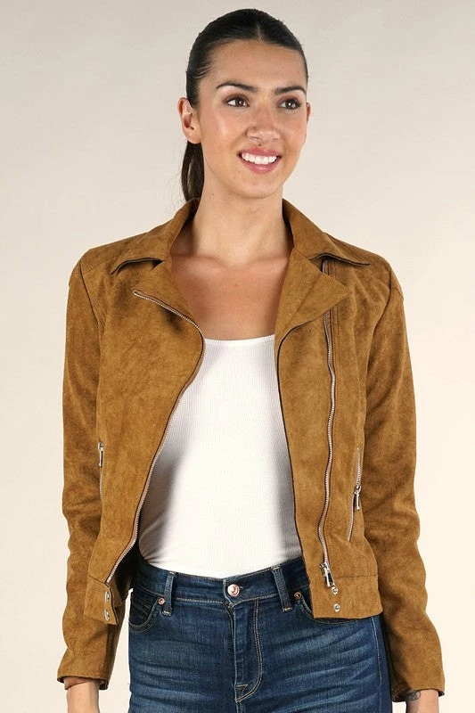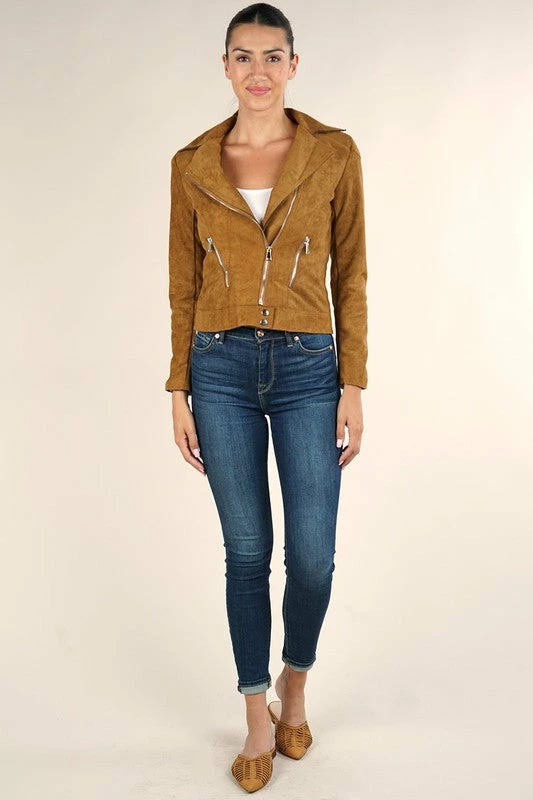 Classic cropped motorcycle jacket in a rich cognac color with zip front and snap details.