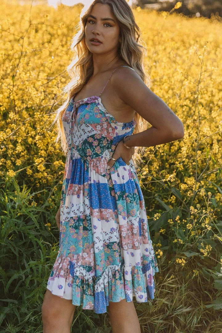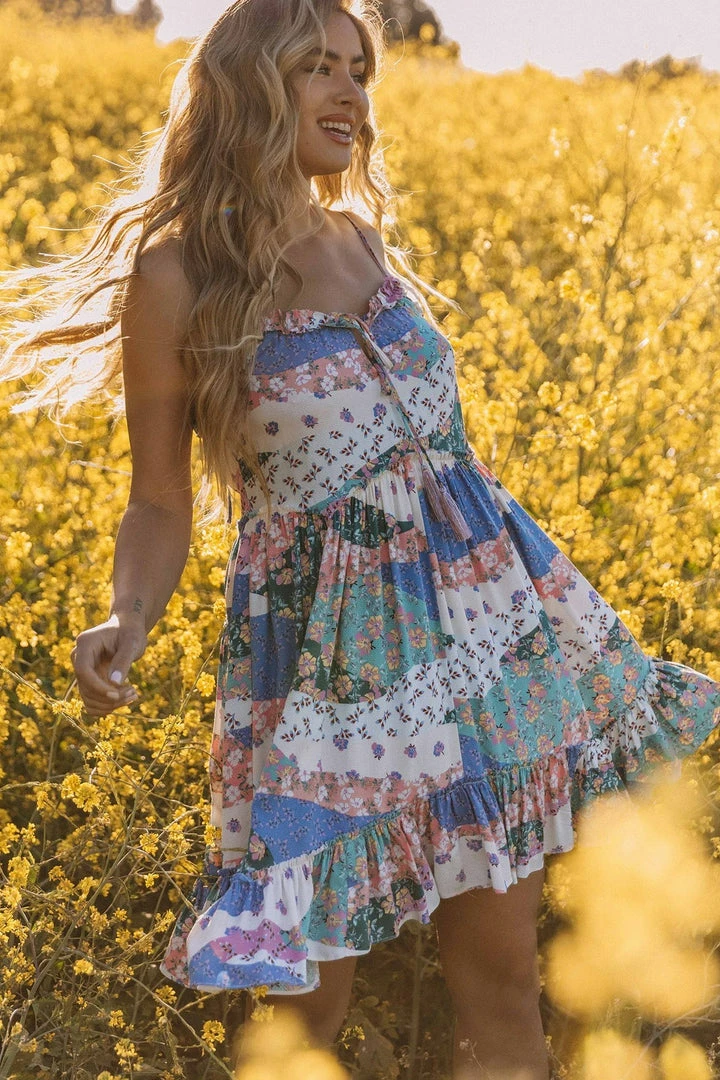 There’s a reason this bohemian mini dress is so popular. Designed in a floral patchwork print, featuring a flattering flowy silhouette, ruffled trim, and an adjustable strappy back. An effortless throw-on-and-go style that can be dressed up or down.