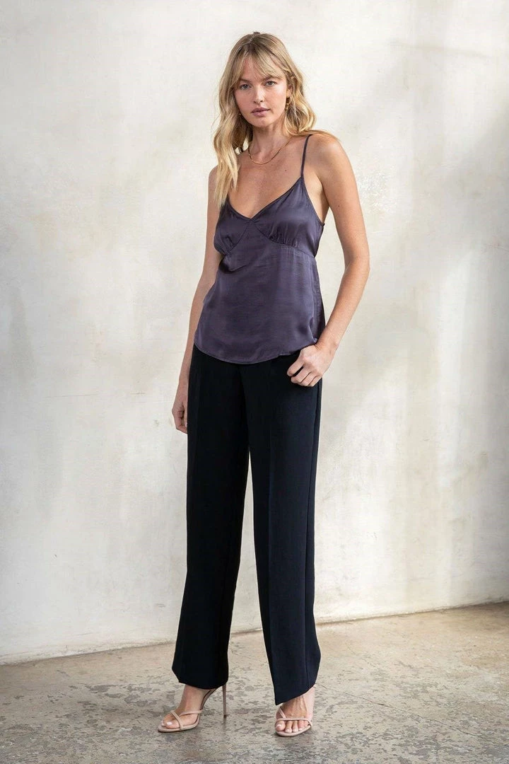 A silky sleeveless camisole with an adjustable spaghetti strap, a lace trim v neckline, back, and hem detail, and a pretty abstract paint stroke design.