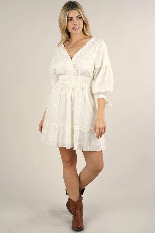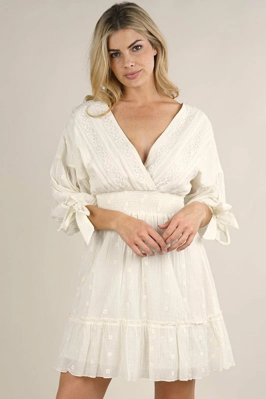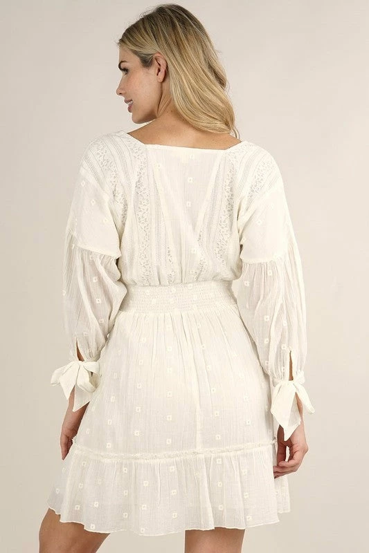 Bohemian mini dress in a soft feather print with subtle metallic details throughout. Featuring a v-neckline, long split sleeves with a smocked elastic wrist cuff, an open back with tassel tie closure, a smocked elastic waist for definition, and a ruffle trimmed tiered skirt.