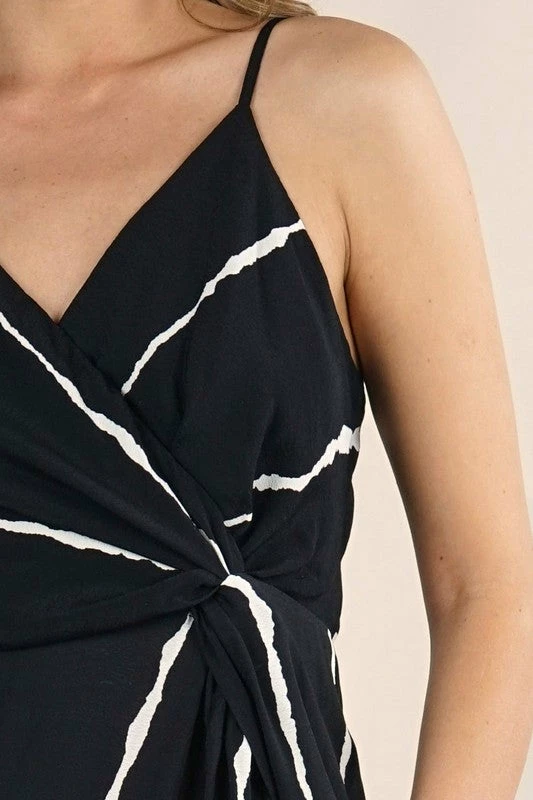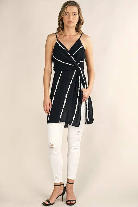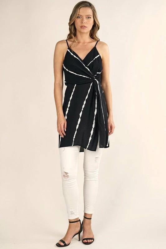 Spaghetti strap blurred stripes twist side tunic with a side slit.