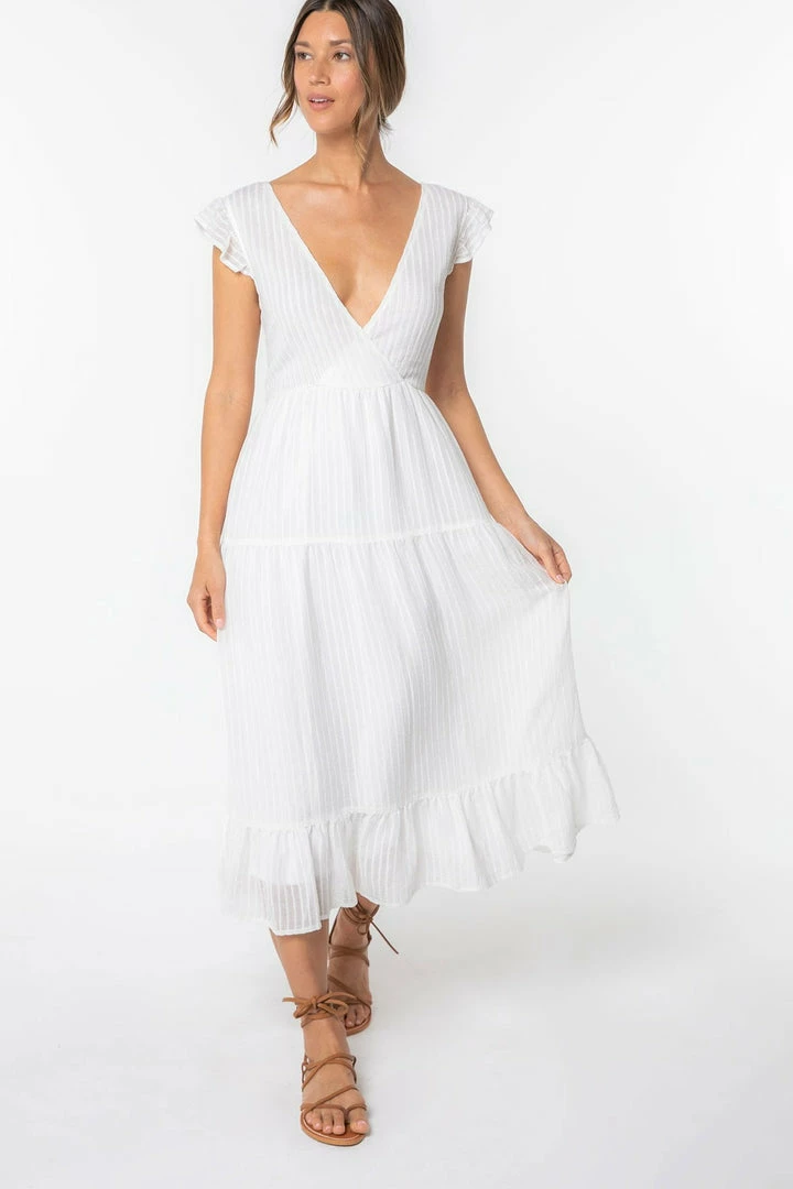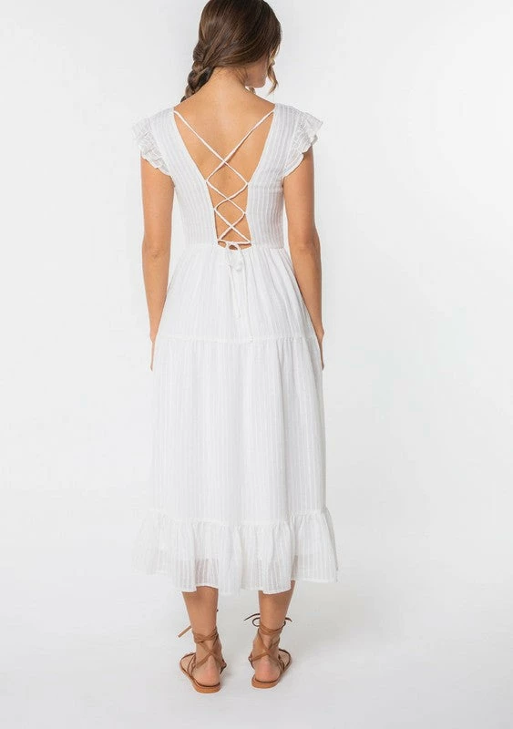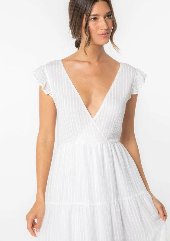 Ultra-romantic and versatile, our Spring mid-length dress is designed in a textured shadow stripe. Featuring short flutter sleeves and a plunging surplice v-neckline. The strappy lace-up back can be adjusted to fit you just right.