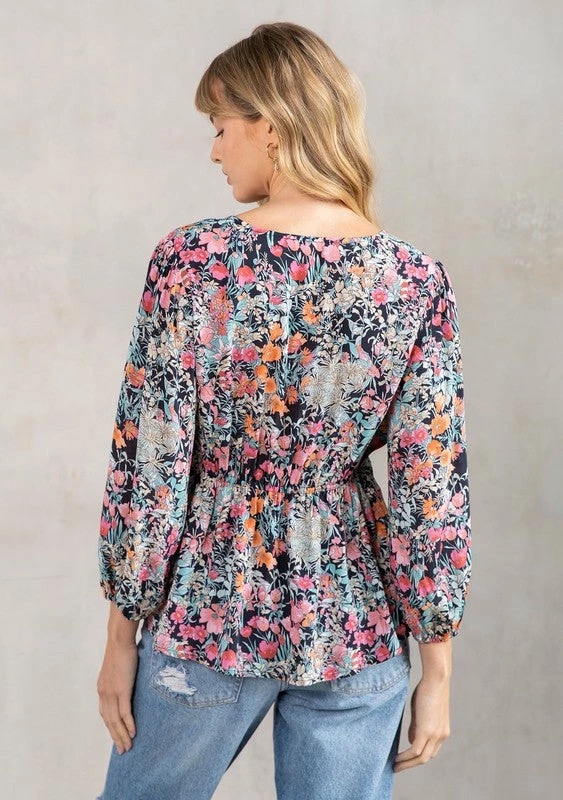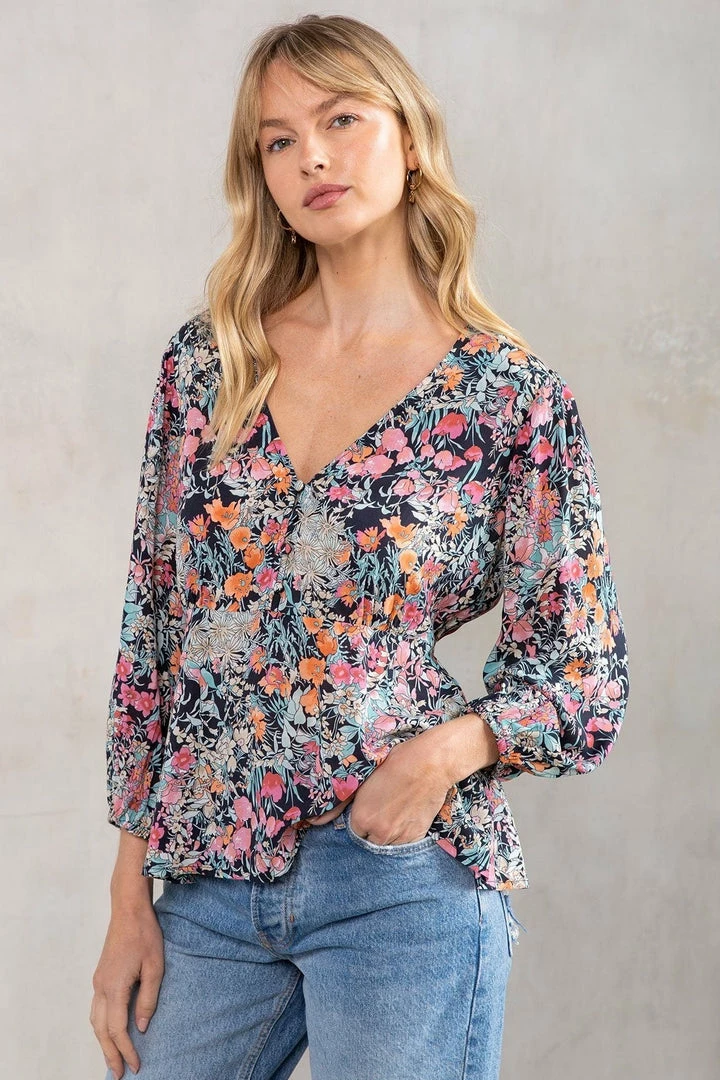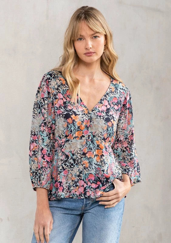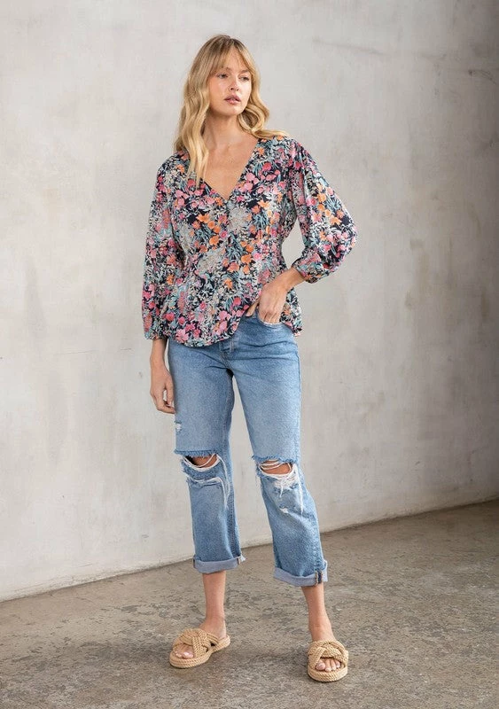 A timeless bohemian top, perfect for Spring. Designed in a vintage-inspired floral print, featuring a flattering peplum waist, delicate self-covered button front, and voluminous 3/4 length sleeves. A charming throw-on-and-go blouse that pairs effortlessly with denim.