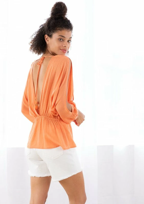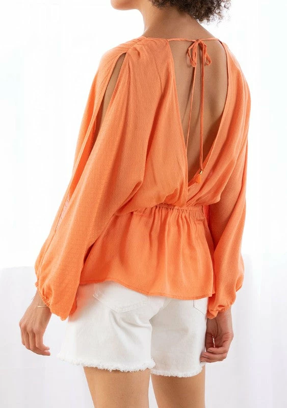 Features long voluminous split sleeve with an elastic cuff, an open back with tassel ties, and an adjustable drawstring waist tie.