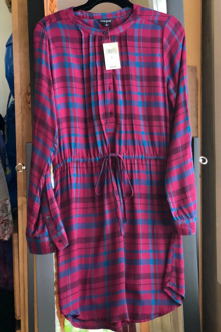 Shirt-dress silhouette in a shining plaid on a comfy fabrication.