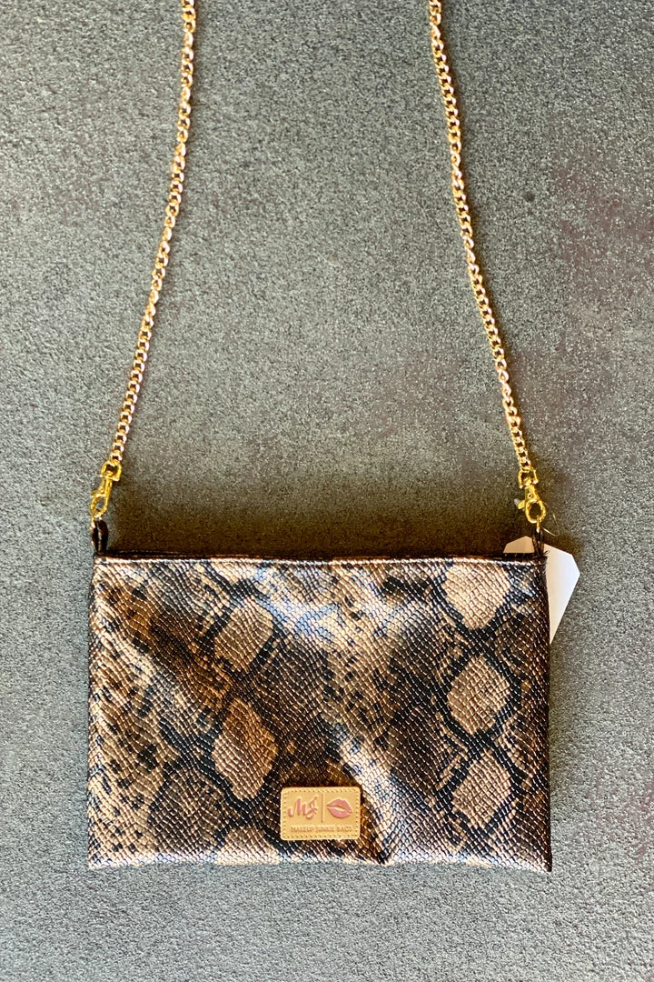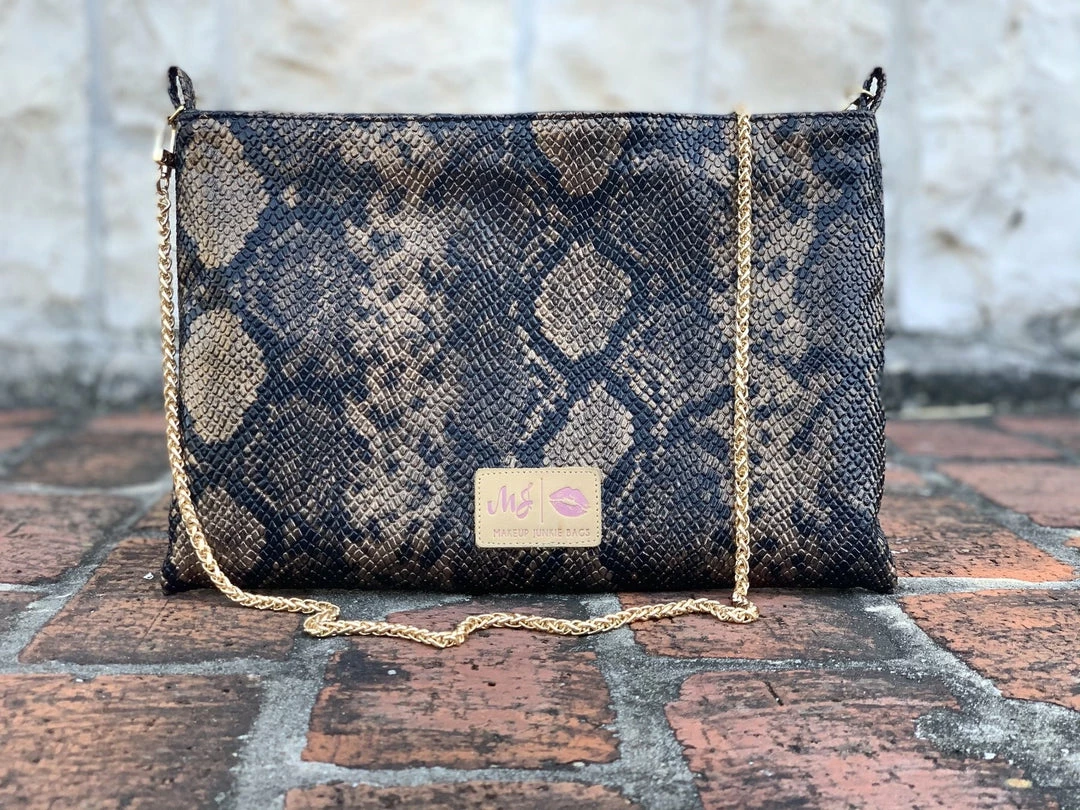 The Serpentina Crossbody bag features our vegan snake exterior. This bag also has a onyx wipeable interior.