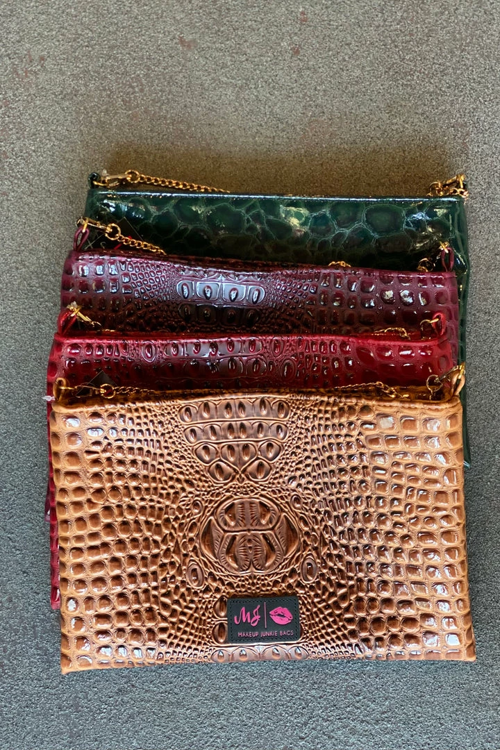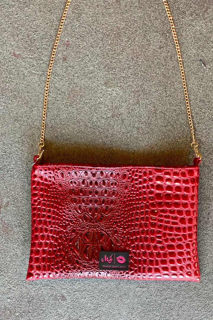 The Bubble Gator Rouge Crossbody bag features Makeup Junkie’s Vegan Gator exterior. This bag also has a black wipeable interior.