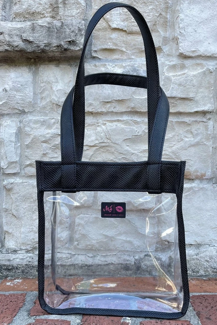 The In The Clear Stadium Tote bag features Makeup Junkie’s Clear vinyl trimmed out with their Black Viper vegan leather exterior.