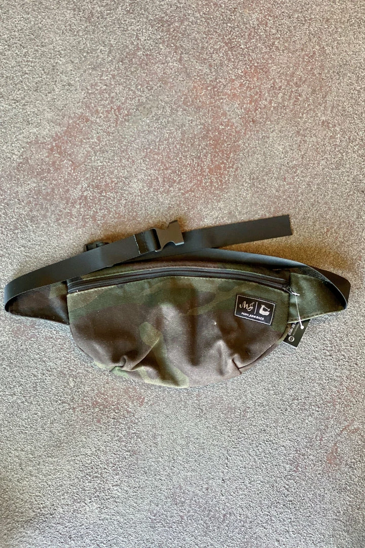 The working man fanny pack features a thick canvas with a thin wax coating and a black moisture resistant wipeable interior.