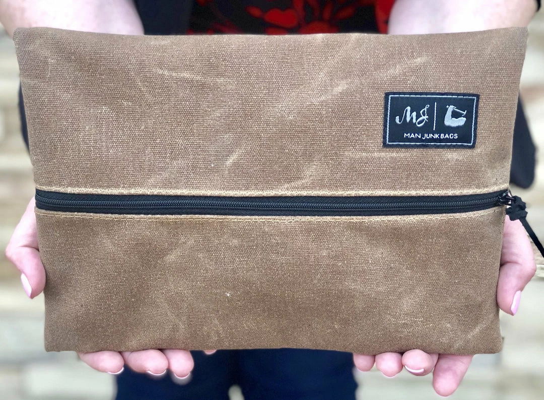 Then Working Man Bag is a thick canvas with a thin wax coating. This bag features our black wipeable interior.