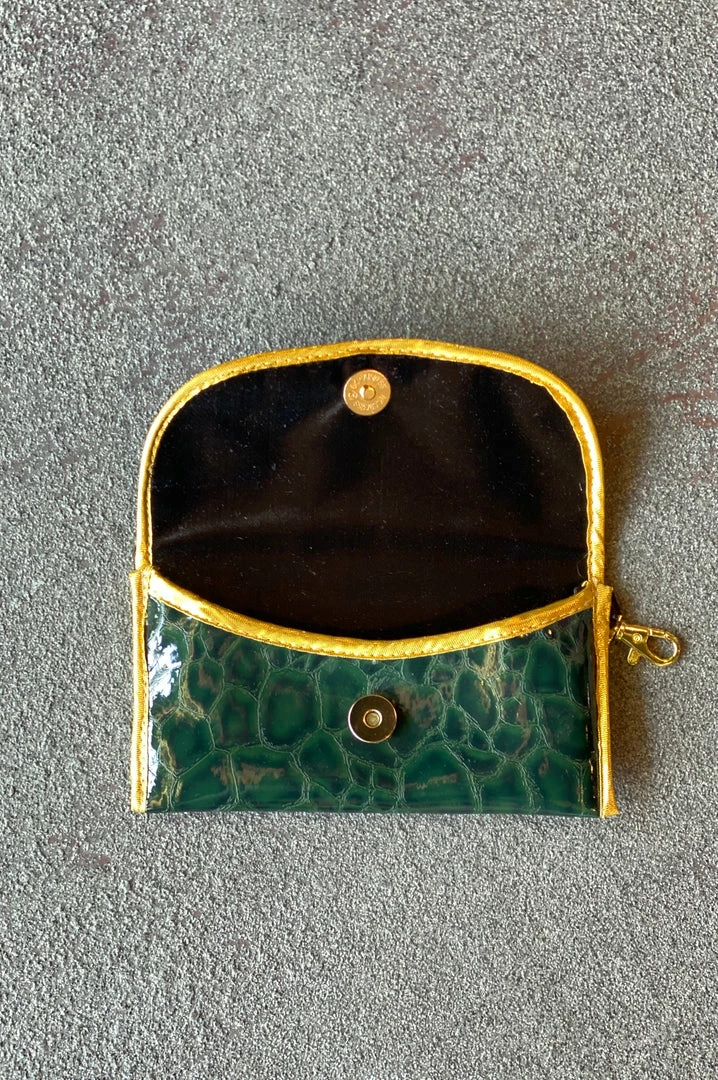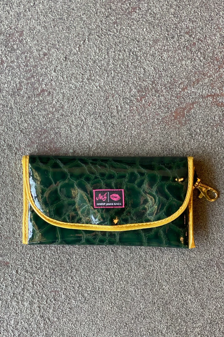 The hunter green sleek gator sunglass case features Makeup Junkie’s vegan patent Gator exterior with a black felt interior.