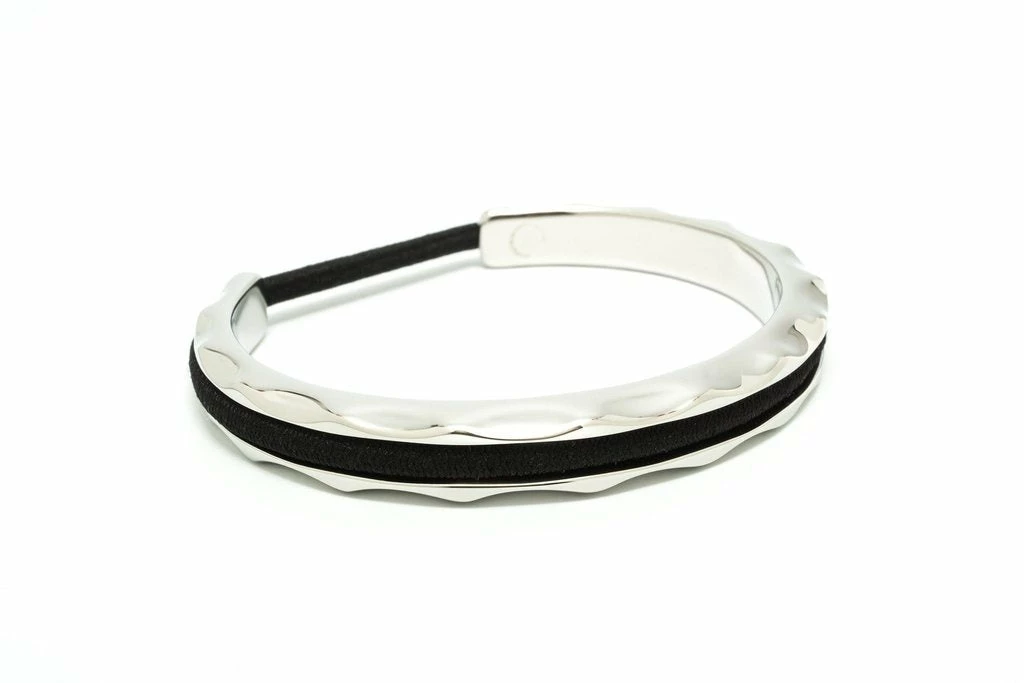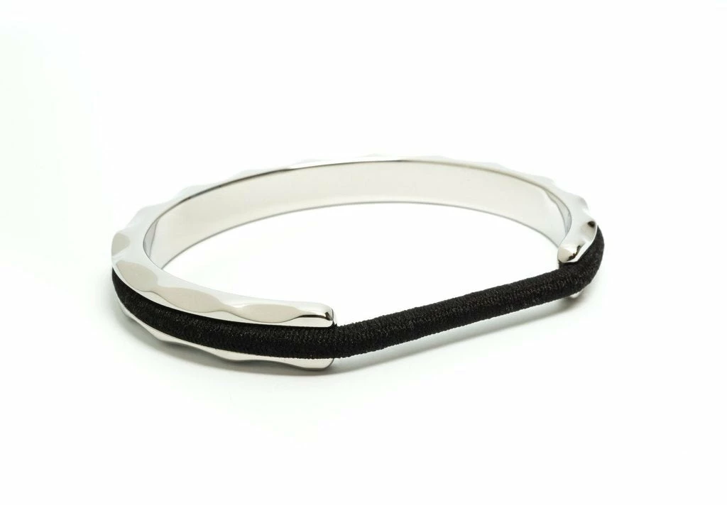 Hair tie bracelet in stainless steel with a silver tone finish.