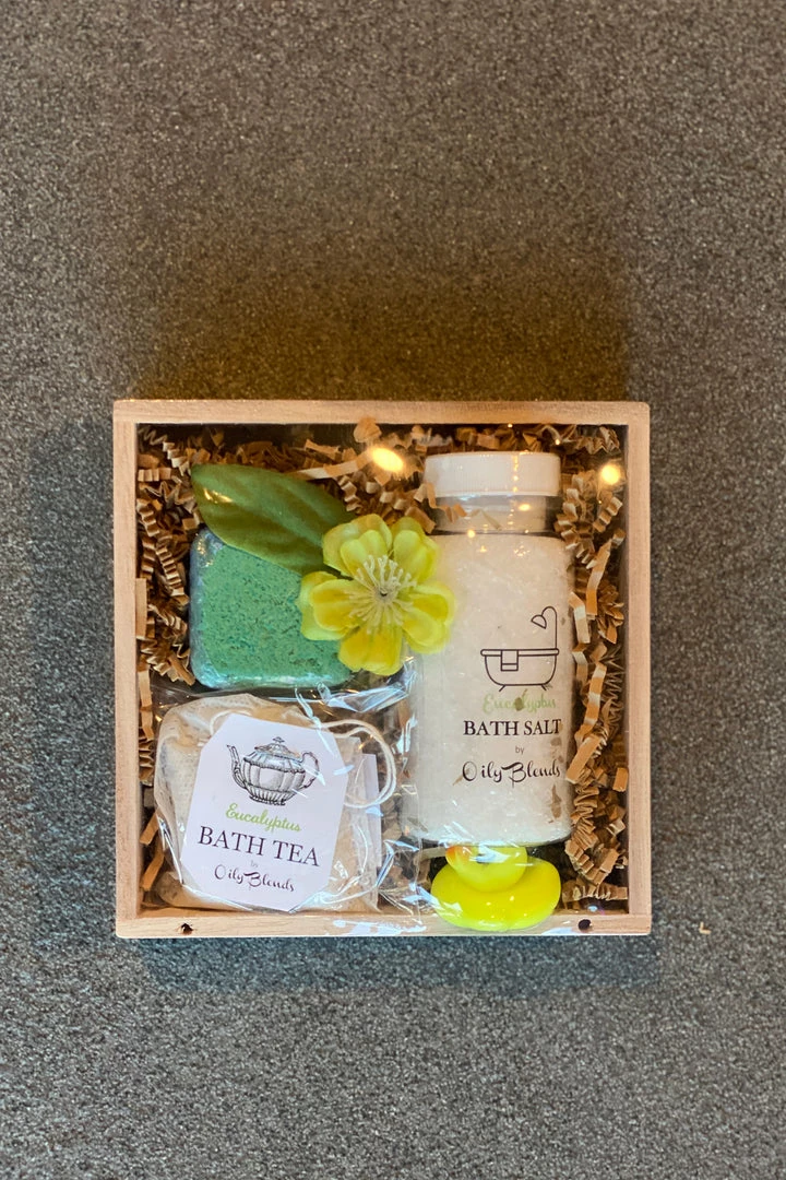 Each set comes with a rubber duckie, hand mixed square bath bomb, bath salt and bath tea.