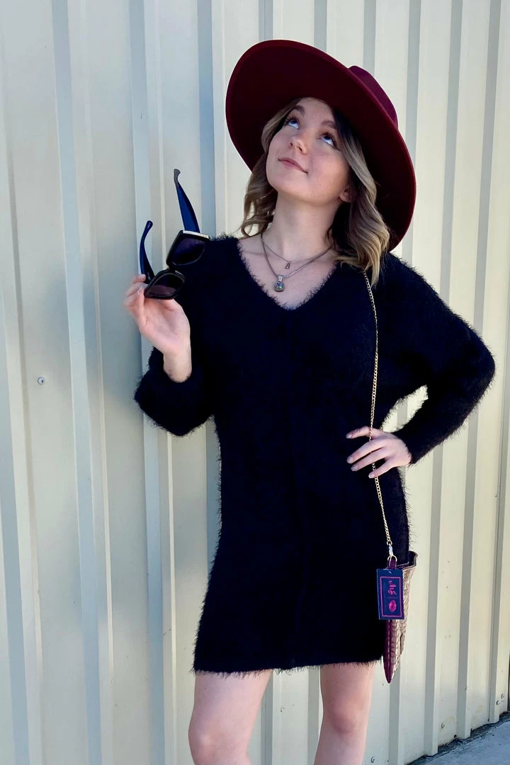 A fuzzy knit sweater mini dress with boat neckline and long kimono sleeves.