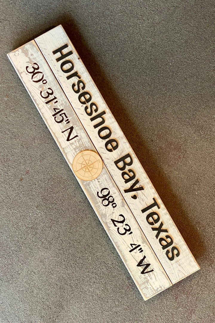 Custom Made wooden sign with Horseshoe Bay, Texas coordinates.